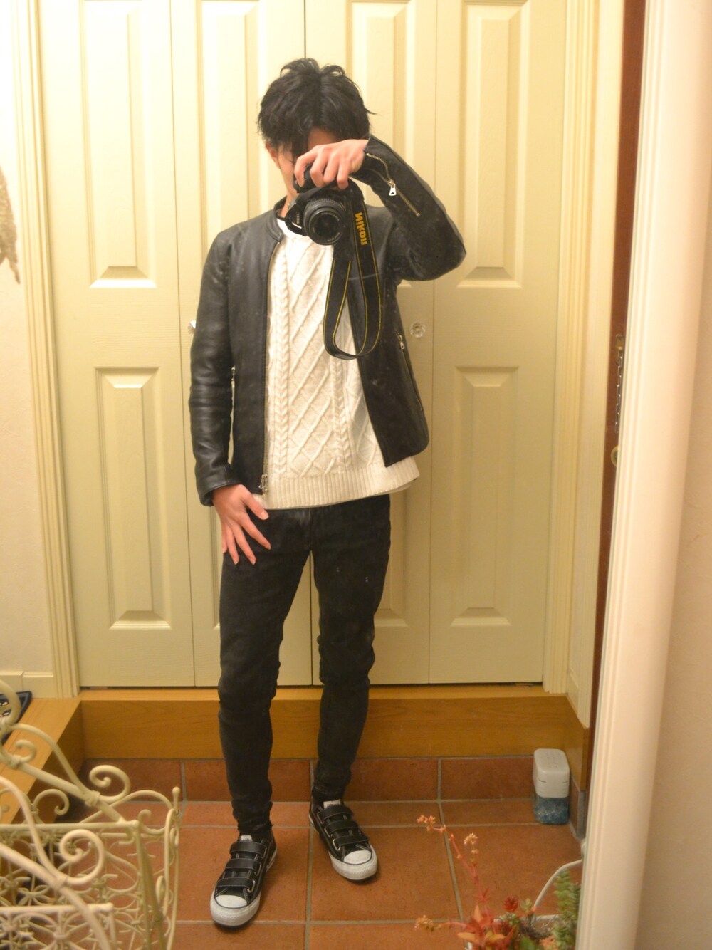 シングルライダースコーデ👕 ロックなイメージが強いしライダースに優しさのある白ニットを組み合わせての定番モノトーンコーデですね! 統一感あって良き😆