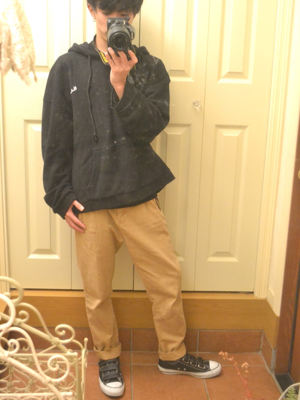 パーカー&チノパンコーデ👕 古着屋さんでだいぶ前に見つけたチノパンを今時風に着てみました! 全体的にダボっと、緩い感じにしました! チノパンの色を考えてトップスと靴は黒に抑えました!