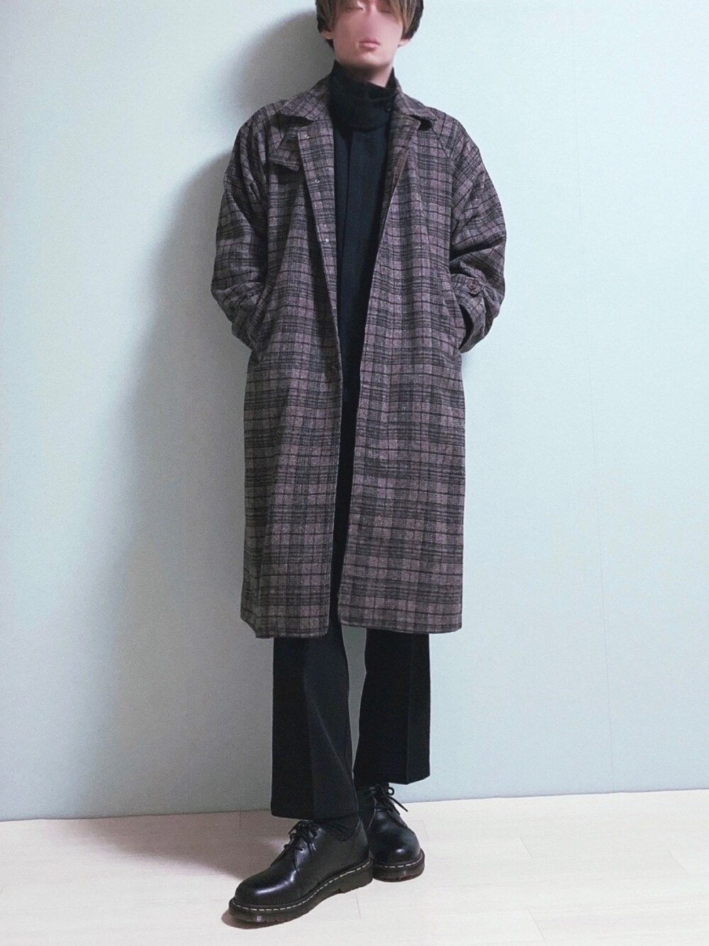 ちょびのステンカラーコート「オーバーサイズ メルトン チェック柄ステンカラーコート」を使ったコーディネート