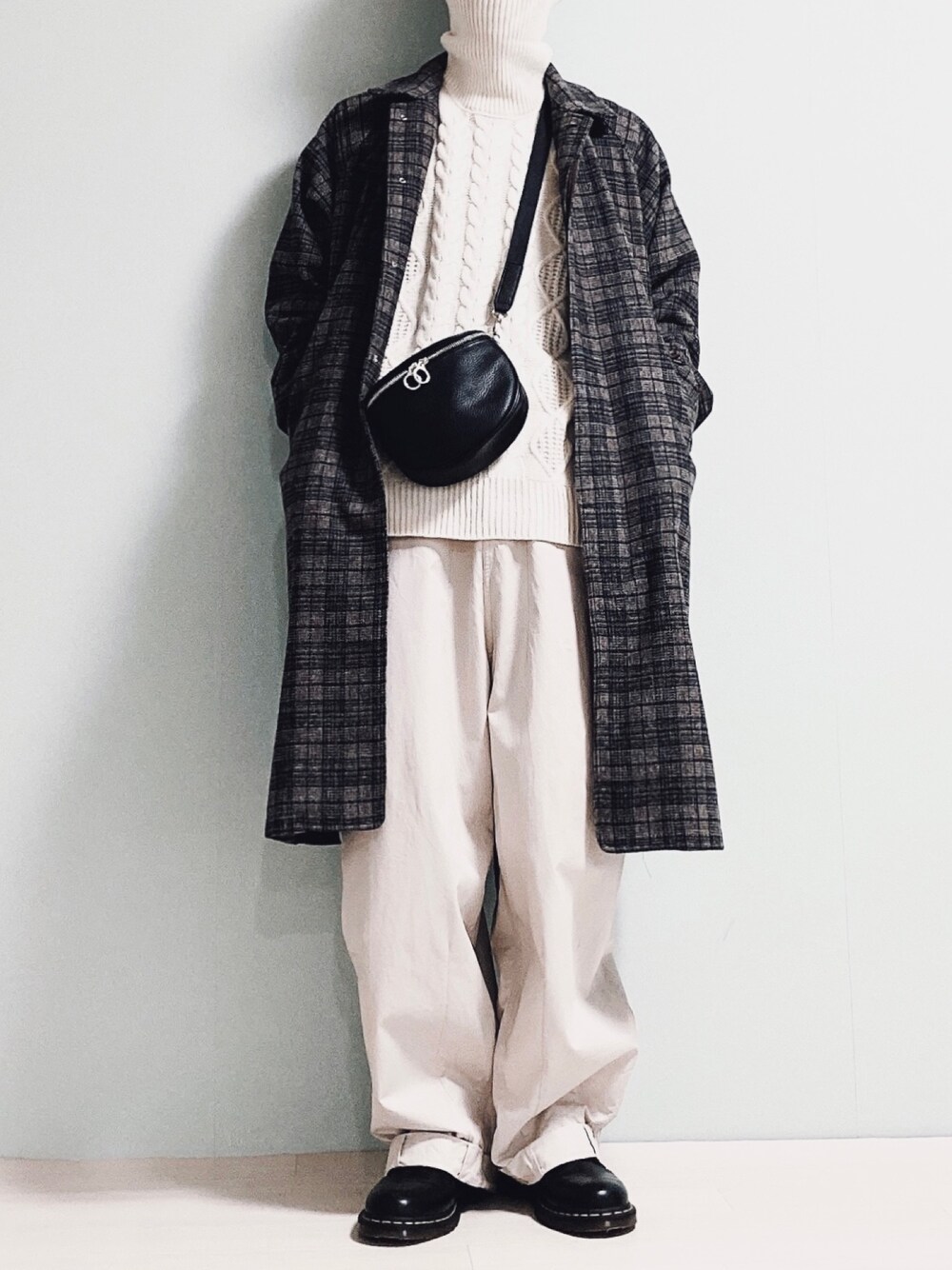 ちょびのステンカラーコート「オーバーサイズ メルトン チェック柄ステンカラーコート」を使ったコーディネート