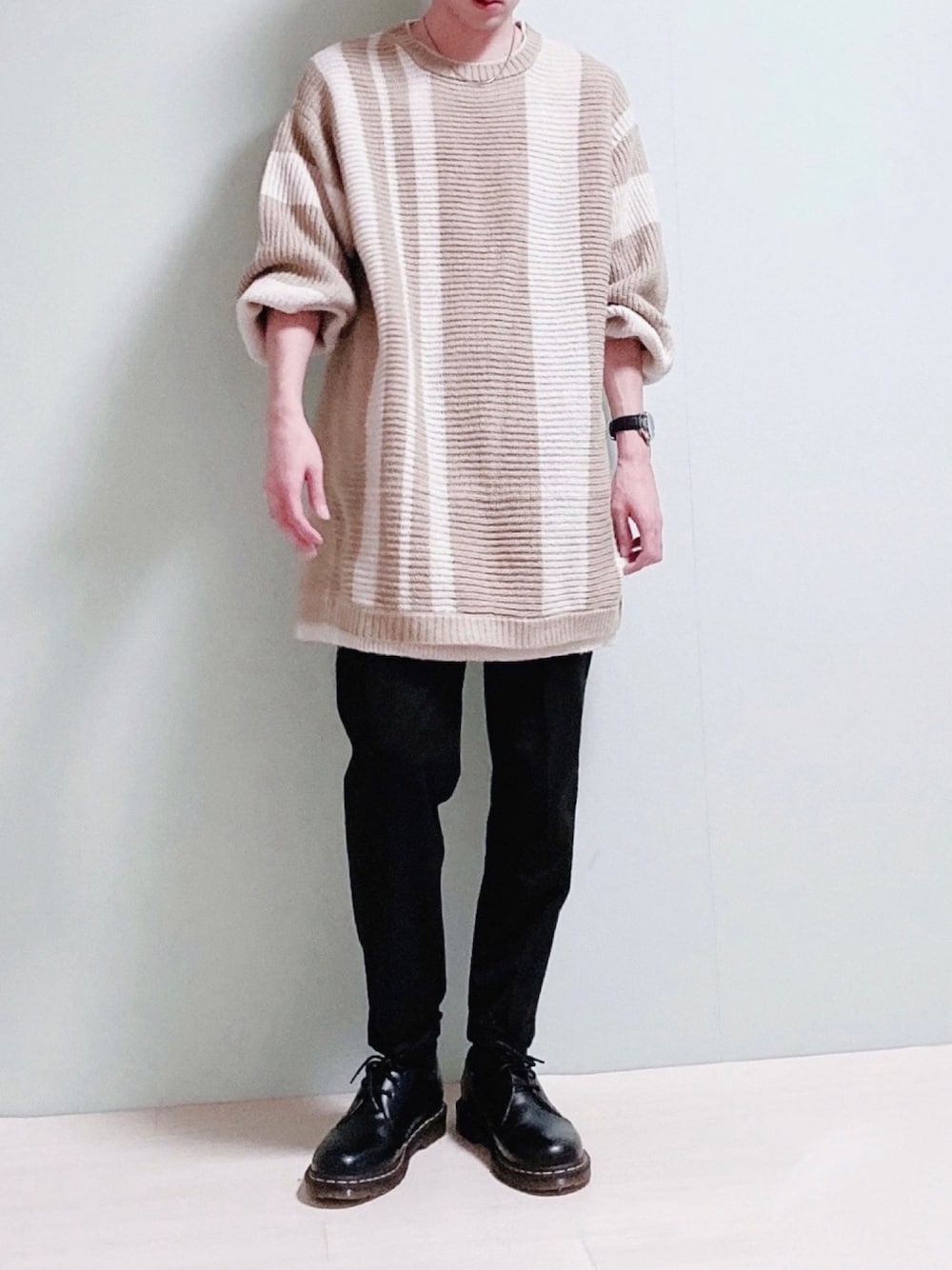 ちょびのニット/セーター「モヘアタッチ配色ストライプスーパーオーバーサイズニット」を使ったコーディネート