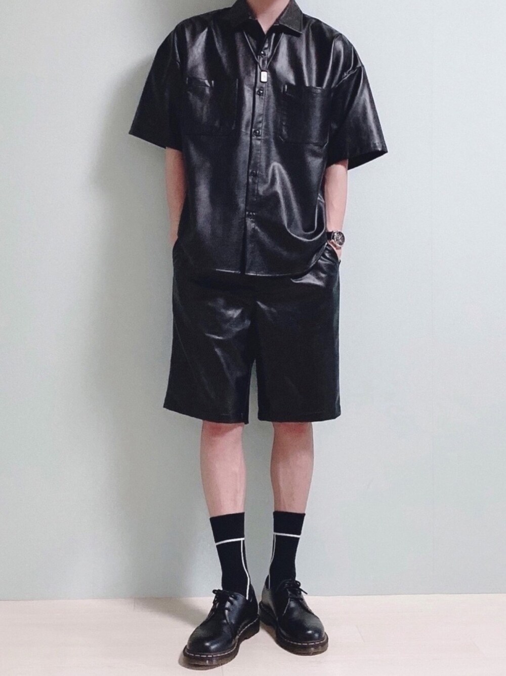 いつもありがとうこざいます CREARE -LINO- 【2021春夏】PUレザーセットアップ フェイクレザーのセットアップ ラムレザーの様な質感光沢🤤 ジャケは5分袖、オーバーサイズなシルエット 前両サイドにポケット ショートパンツは短過ぎず、長過ぎない緻密に設定をされたレングス丈 単体でもめちゃめちゃ使えそうです 今日¥1,000クーポンです