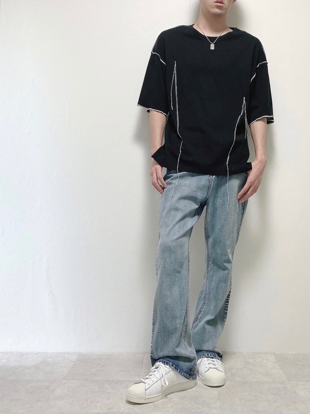 ちょびのTシャツ/カットソー「配色 アウトロック アシメデザイン オーバーサイズ Tシャツ」を使ったコーディネート