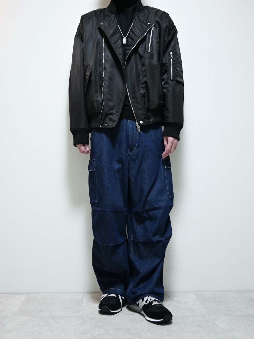 ちょびのMA-1「オーバーサイズ ワイドスリーブ キルト中綿 ライダース MA-1<ユニセックス>」を使ったコーディネート
