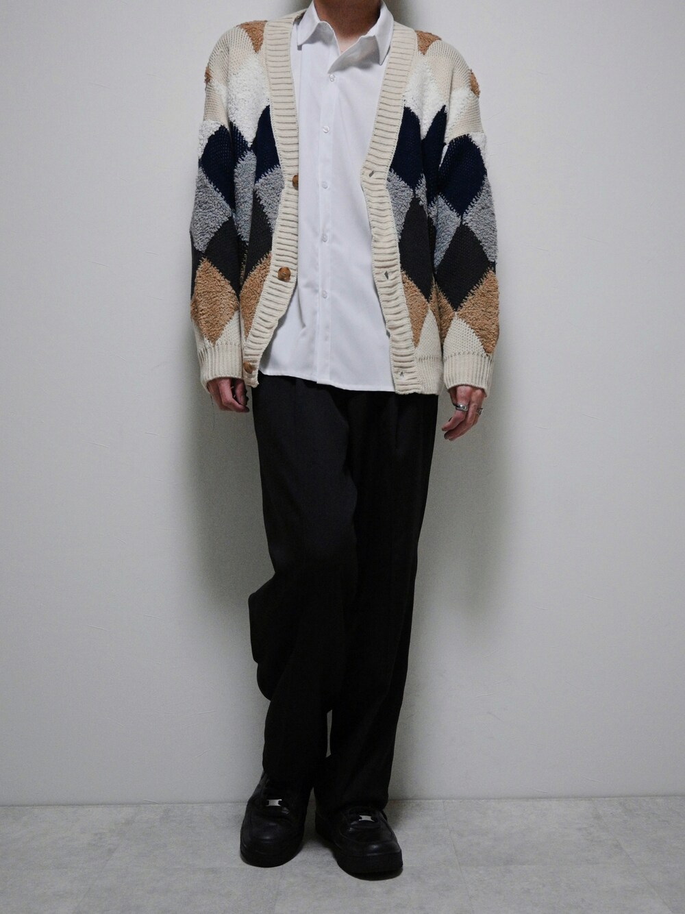 ちょびのカーディガン/ボレロ「アーガイル柄ボリュームカーディガン」を使ったコーディネート