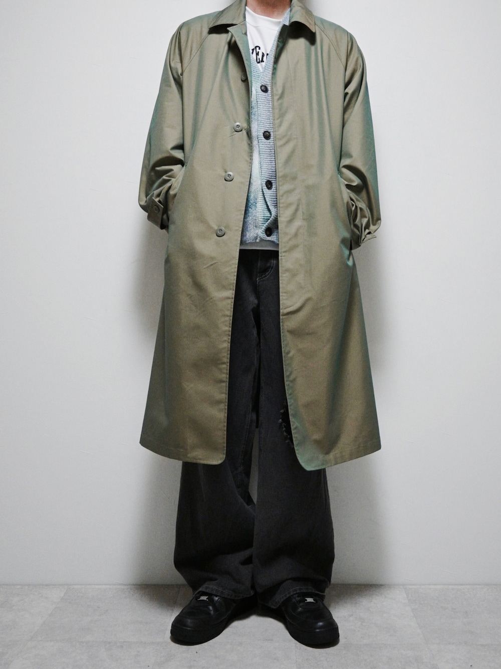 ちょびのステンカラーコート「【2WAY】 オーバーサイズ ルーズ ステンカラースタンドロングコート タマムシコート<ユニセックス>」を使ったコーディネート
