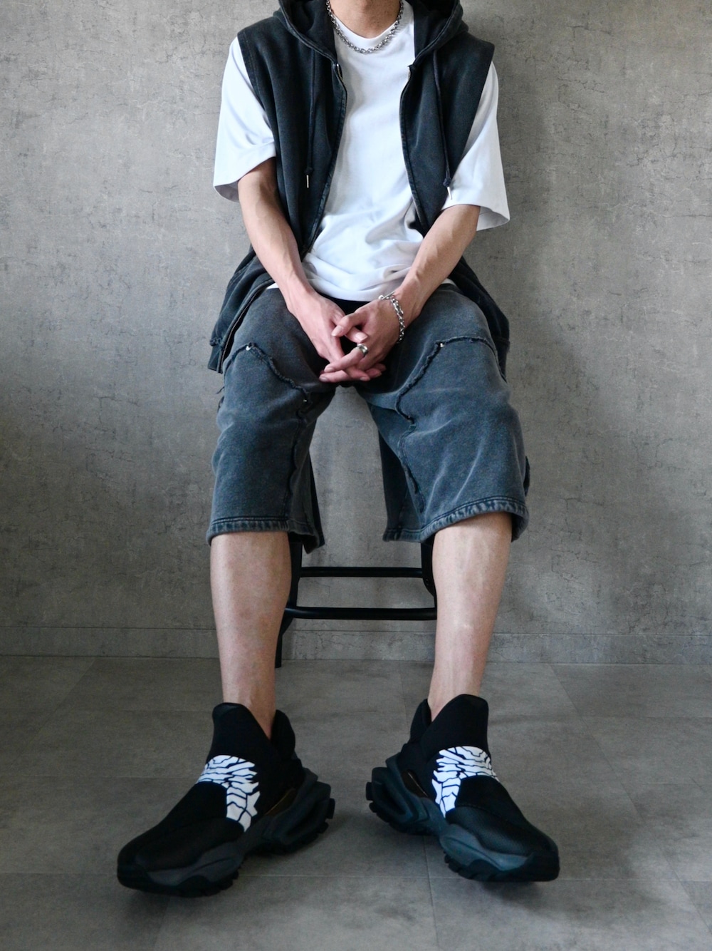 Starting Overのセットアップ 薄手のスウェット素材 ハーフパンツとベストのセットアップ ケミカル加工でフード大きめ パンツの丈感も気に入ってます リングもStarting Overのです デザインがカッコいいですよね