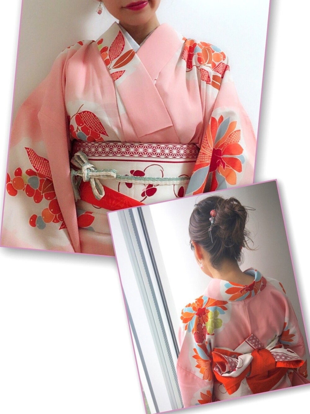 着物風に👘✨ 半衿自分で着けました♡ 半幅帯はマミーが昔使ってたもの♡ ピンクの浴衣をいかに大人可愛く着こなすかがポイント(^^)