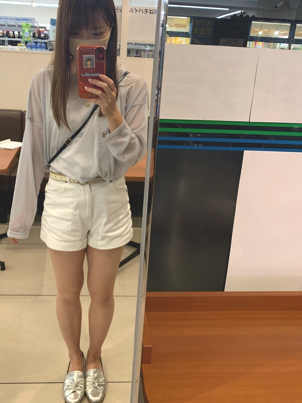 ブルー系のシャツ/ブラウスを着用したレディースの夏コーディネートの1枚目の写真