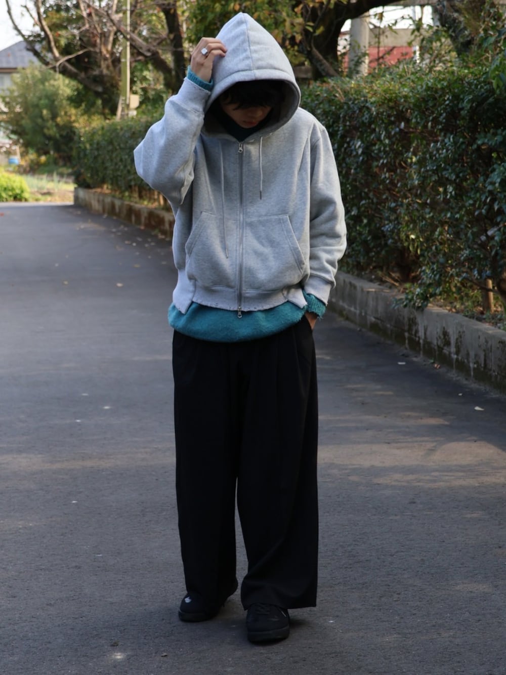 パーカーのインナーにニットを着込んで見たら 意外と相性が良かった!グレーとターコイズで 寒色同士にまとめれてるのも⭕️ あとシンプルに暖かい笑 Instagram@shuta_wear TIKTOK@shuta_wear