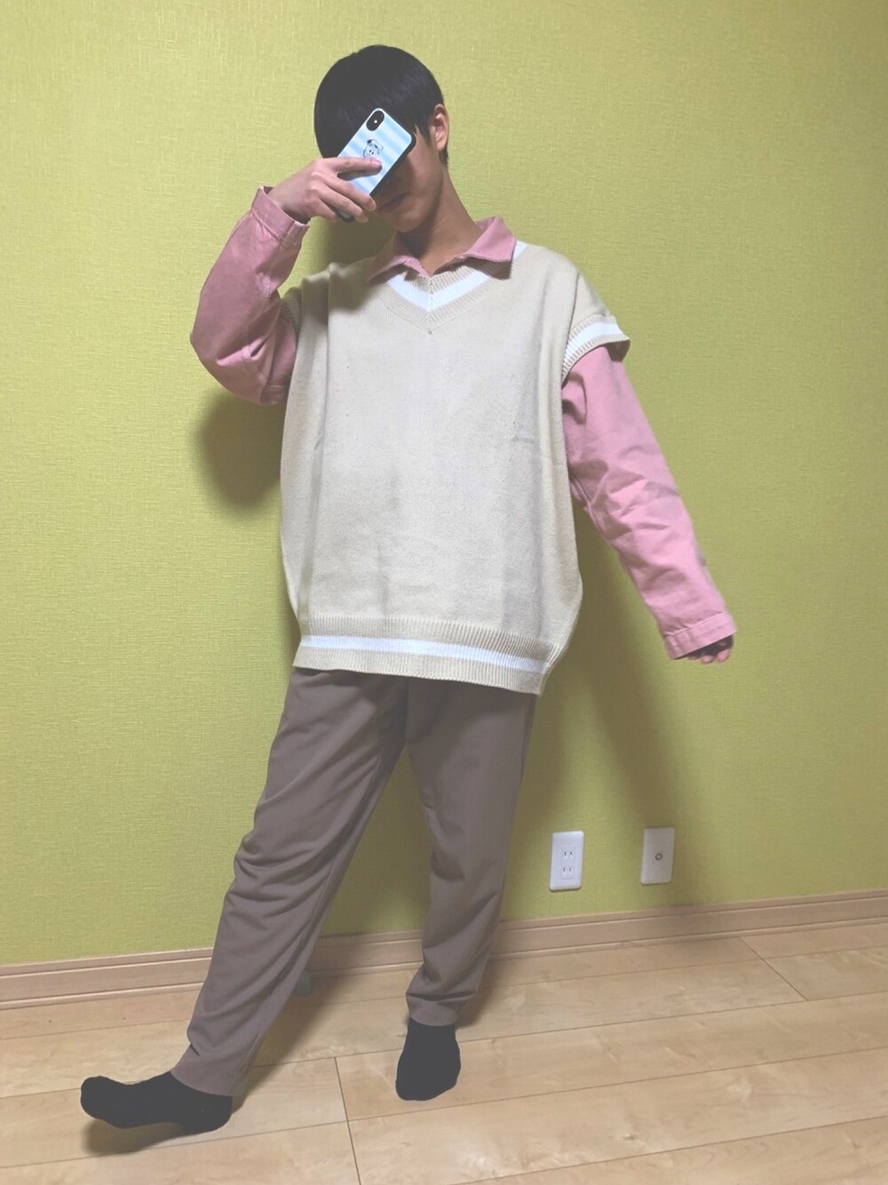 春らしいピンクとベージュのコーデ このニットベストの色かわいい