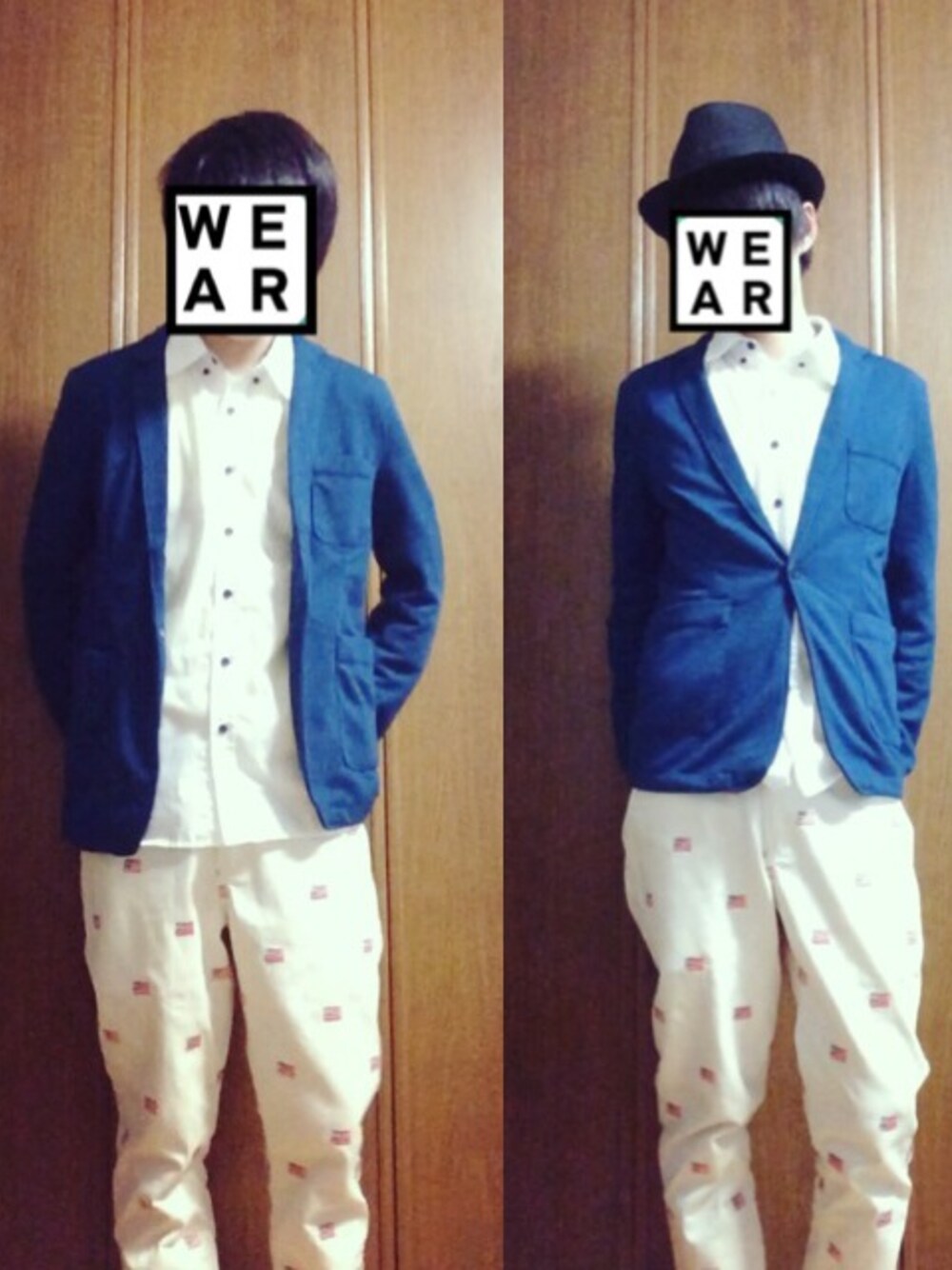 春仕様でございます。 シャツとジャケットの定番キレイめてきなコーデに、柄モノのチノパンでかわいさを出してみました。