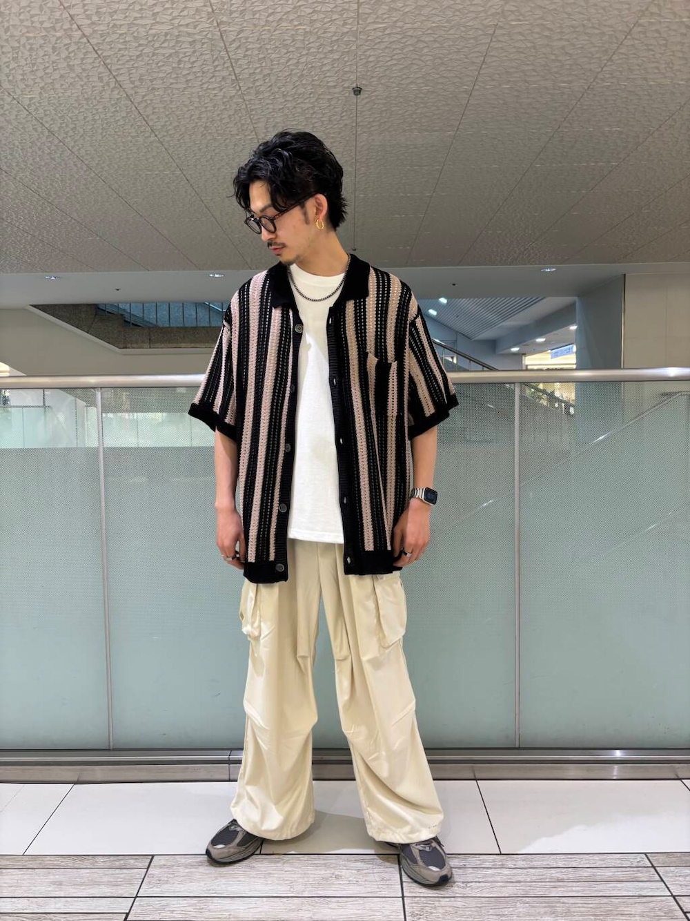 涼しげなメッシュのニットシャツに白のカーゴパンツでかなり夏を意識したコーデにしました!