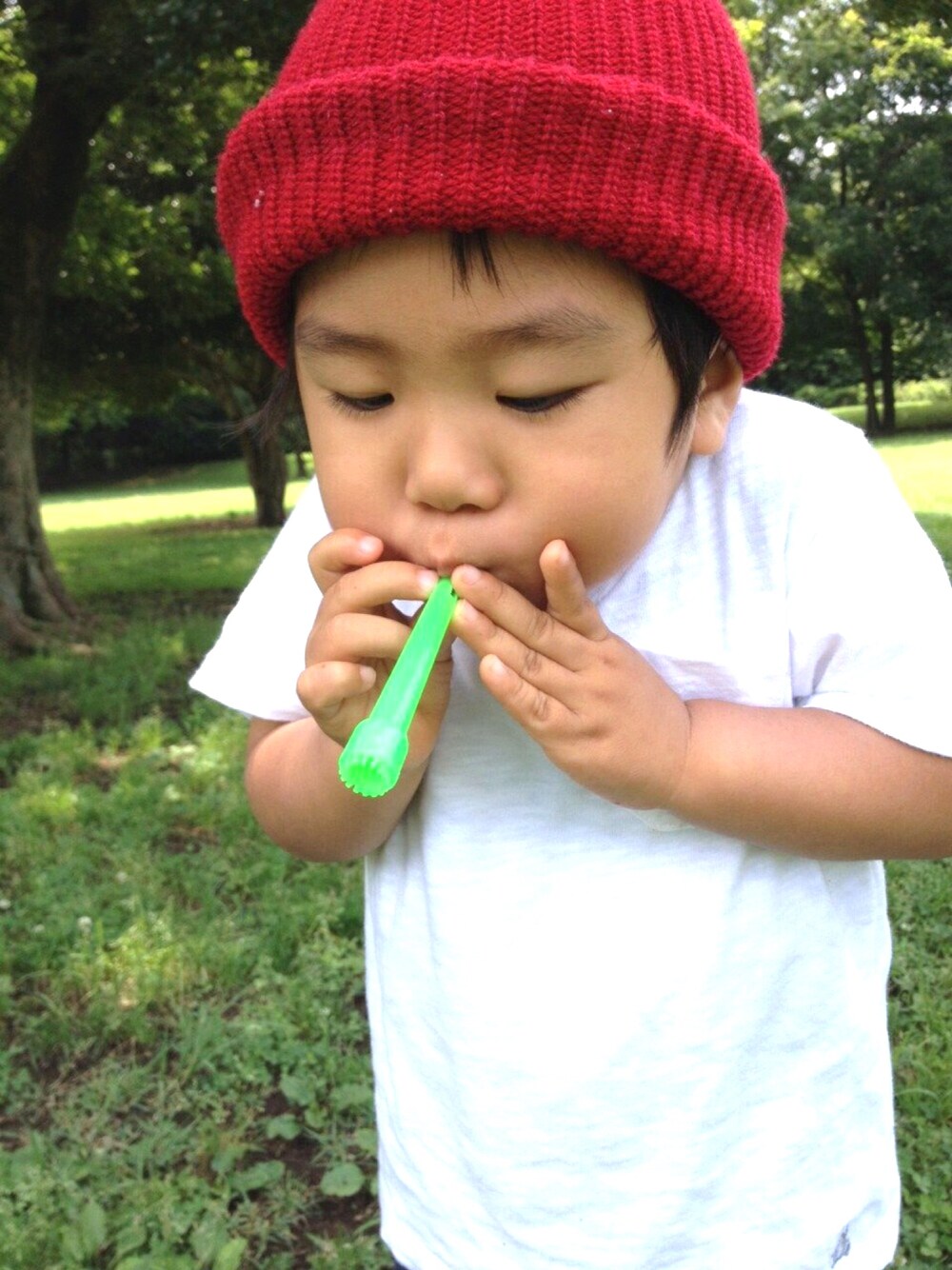 2歳の夏。公園でシャボン玉。勢いよく吹きすぎて泡も飛ぶ。