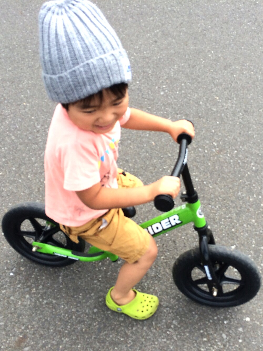 3歳。ストライダー練習。Tシャツは貰い物。Leeのニット帽はかわいい。