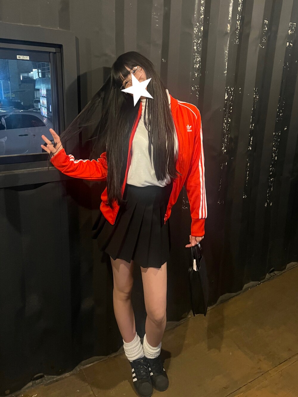 だんだん暖かくなってきて嬉しい🫶🏻 今日はadidasコーデ🎀 adidasの赤のトラックジャケットが超可愛くてお気に入り❤️スポーティなアイテムにgirlyなプリーツスカートやルーズソックスをミックスさせました🥺🩵 このメガネが超絶カワイイ😖🩷‼️ 最近はアクセサリー、小物を集めるのにハマってます🤙🏾💘 ★高校2年生 169cm insta→@shhhhx87