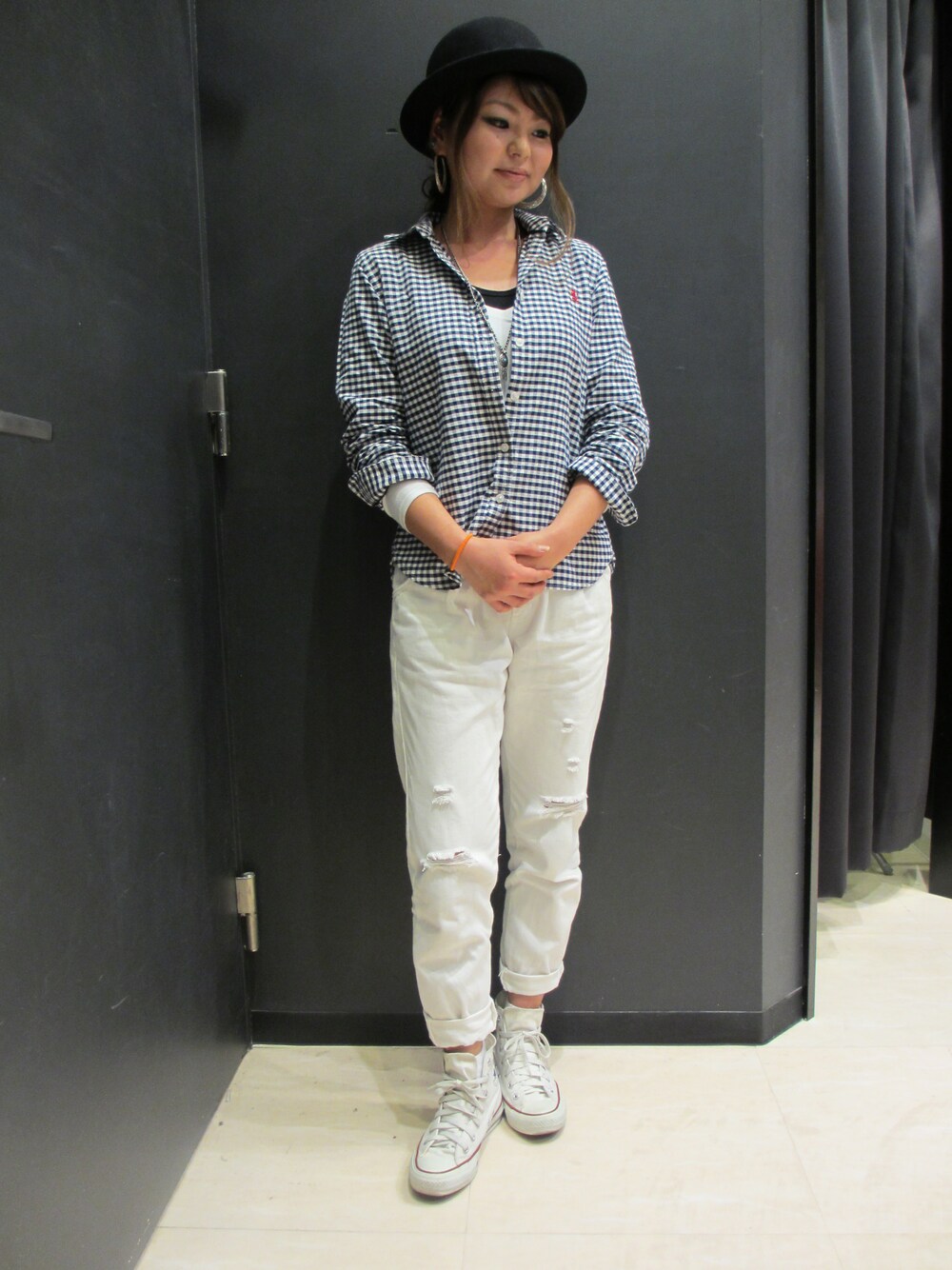 GIORDANO南砂町SC SUNAMO店 STAFF:石井 春っぽく、ギンガムチェックのライオン刺繍オックスシャツと白のダメージパンツで合わせました!!