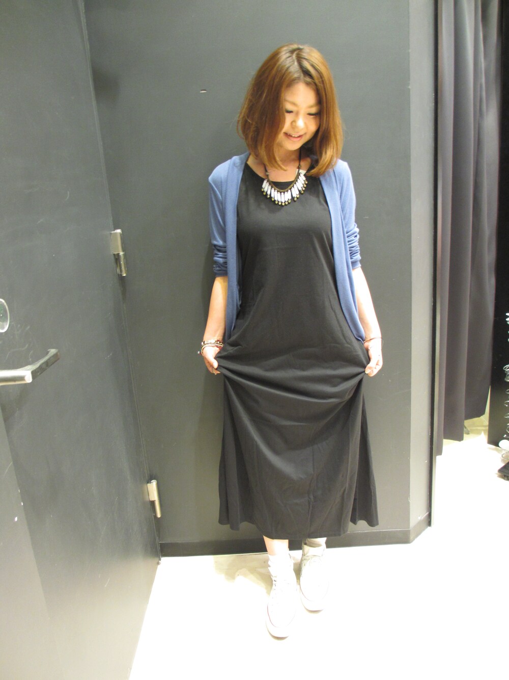 GIORDANO SUNAMO店 スタッフ:石井 こんにちわ!!今日はこの前入荷したマキシスカートに合わせ、涼しいので、トッパーカーデのレギュラーを羽織って、シンプルにしてみました!!