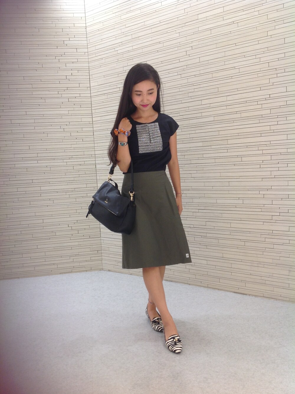 カーキとブラックの秋を意識したコーディネート♪ 足元はゼブラ柄で今年のトレンドをおさえました! バックは飽きのこないシンプルなデザイン☆ 使い勝手もいいので長くご愛用頂けます^^