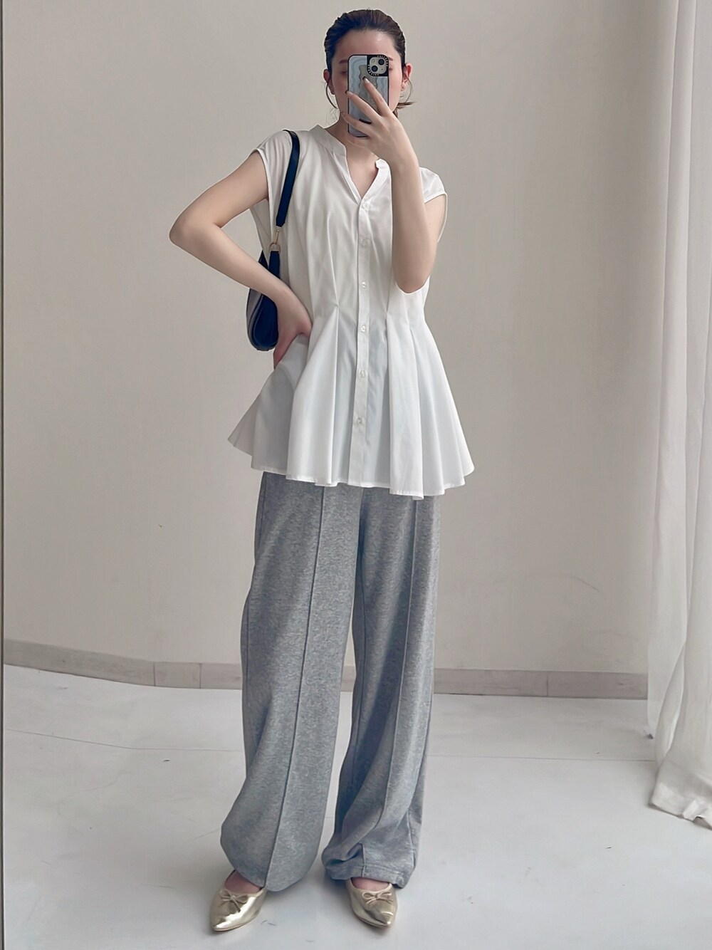 スウェットパンツに白のペプラムブラウスを合わせてガーリーに🧸🩰🤍 ペプラムシャツで脚長効果も🤭 ーーーーーーーーーーーーーーーーーーーーー 身長:157cm 骨格:ウェーブ