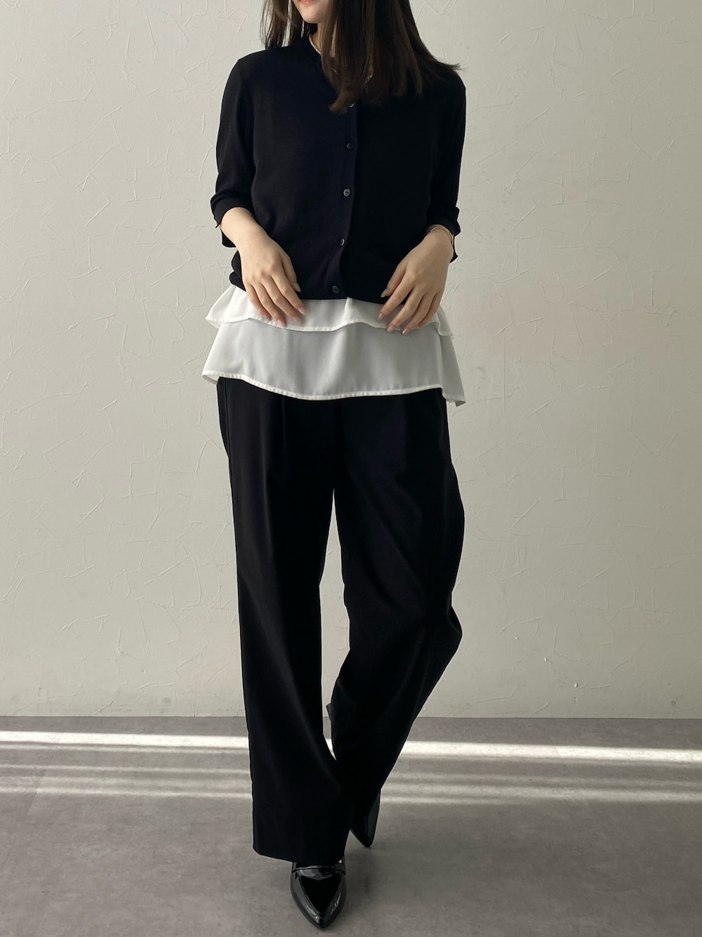 ノースリーブブラウスの上にカーディガンを合わせたレイヤードコーデ🤍🤍 カーディガンはサラサラした生地で袖にスリットが入ってるのでより細見え! ーーーーーーーーーーーーーーーーーーーーー 身長:157cm 骨格:ウェーブ