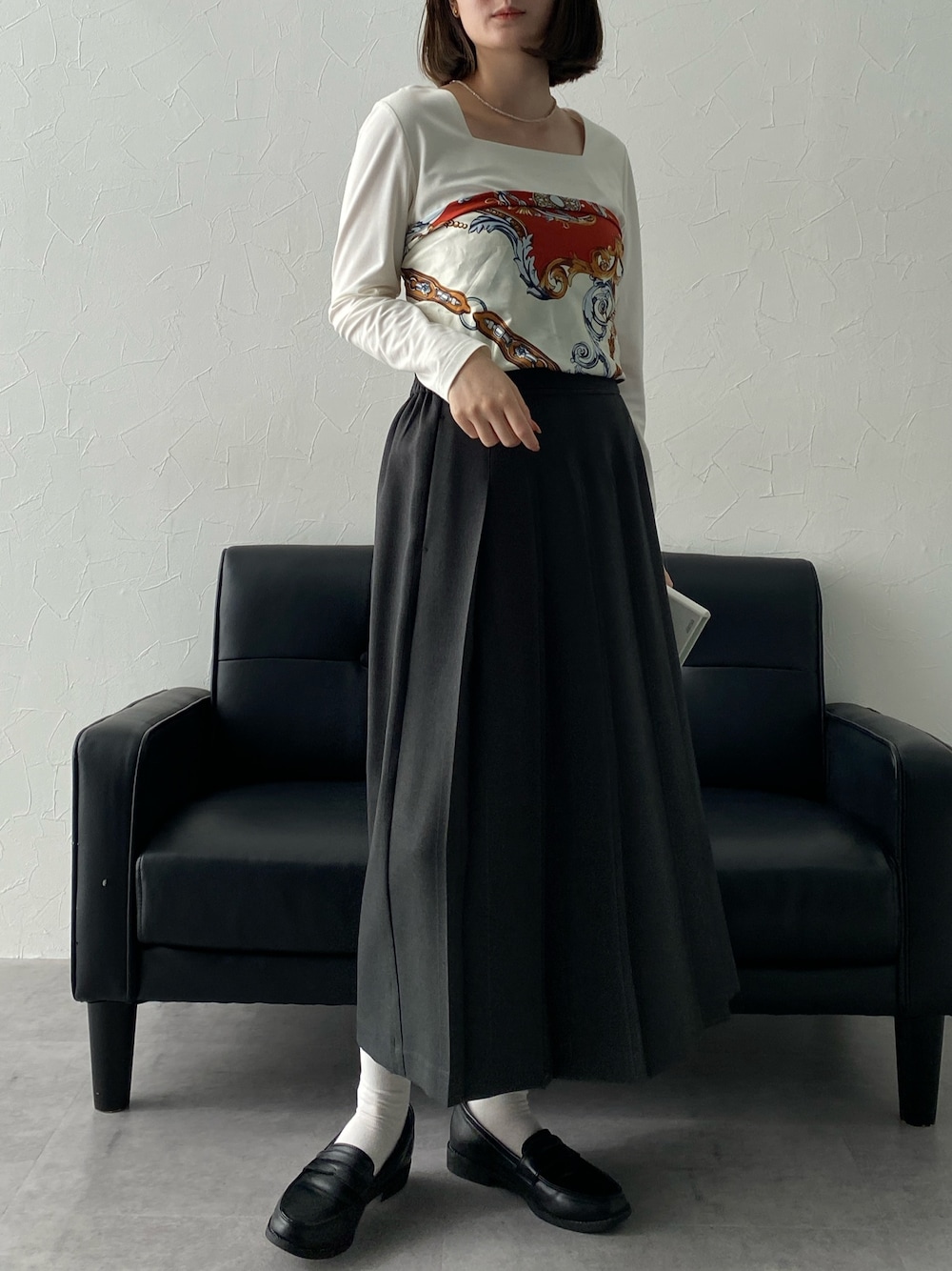スカーフをビスチェ風に巻いて、コーデのアクセントに🧣♡ プリーツスカートとローファーでクラシカルにまとめつつ、白ソックスで抜け感を意識🤍 ーーーーーーーーーーーーーーーーーーーーー 身長:157cm 骨格:ウェーブ
