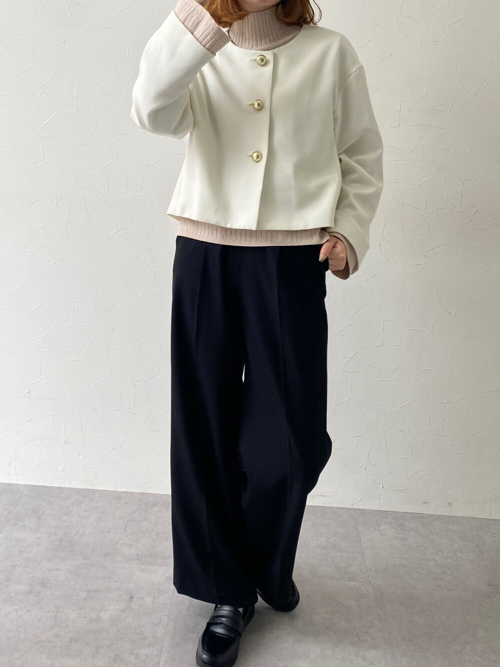 トレンドのショート丈ジャケットを主役にし た、大人のモノトーンスタイル🖤🤍 ゆったりした黒のワイドパンツも、ショート丈のジャケットを合わせることで重心が上がり、脚長効果抜群! インナーには肌馴染みの良いベージュのタートルネックニットを合わせて、柔らかな雰囲気に🤭 ーーーーーーーーーーーーーーーーーーーーーーーーー 身長:157cm 骨格:ウェーブ