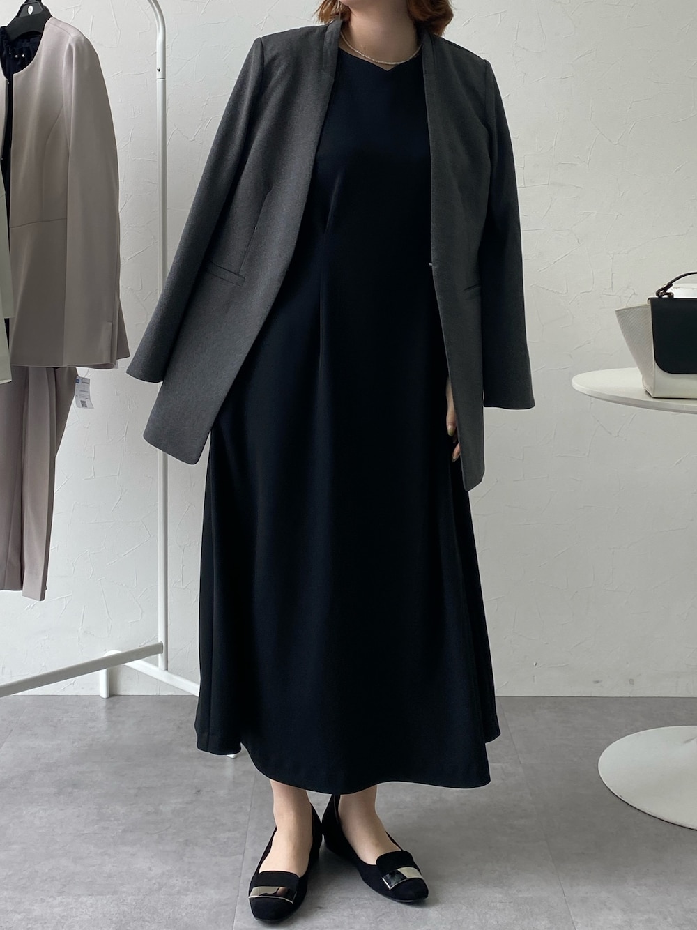大人のきれいめスタイル✌🏻 黒のシンプルなロングワンピースに、ニュアンスのあるグレーのジャケットを肩掛けしてこなれ感をプラス🫧🤍 ーーーーーーーーーーーーーーーーーーーーーーーーーーーーー 身長:157cm 骨格:ウェーブ