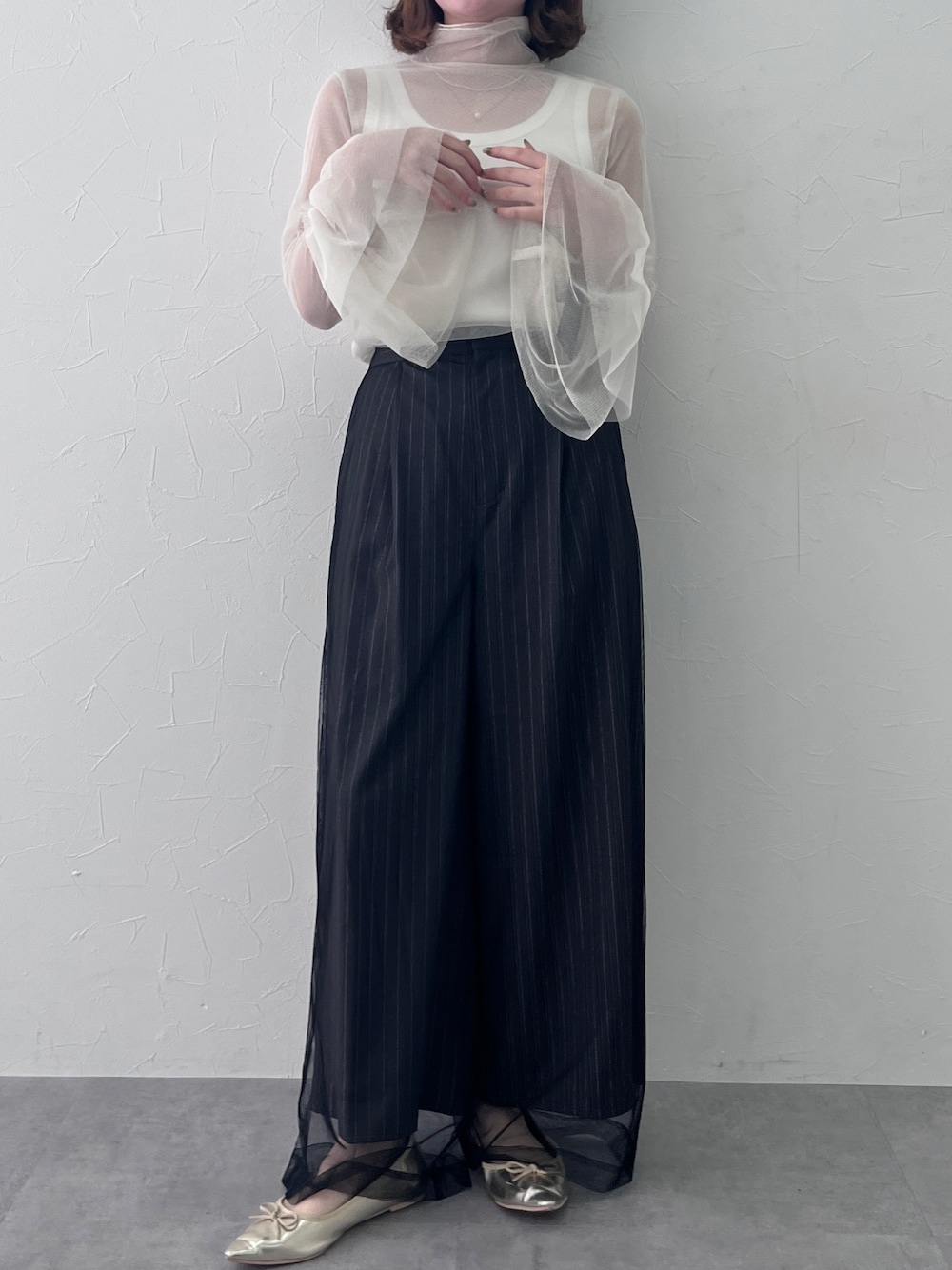 ボリュームのあるフリル袖がドラマティックなブラウスが主役🤍 透け感のある素材だから、甘くなりすぎず大人っぽく! ボトムスはストライプで縦長効果を意識👍🏻 ーーーーーーーーーーーーーーーーーーーーーーーーーーーー 身長:157cm 骨格:ウェーブ