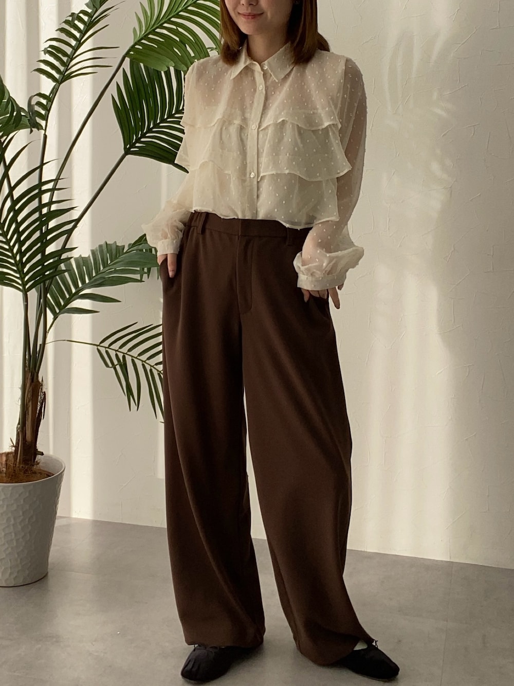 シアー感×フリルの甘めブラウスを、こっくりブラウンのワイドパンツで大人っぽく! 透け感のあるブラウスは、ドット柄が入っていて1枚で主役級の可愛さ🤎🤍 重たくなりがちなワイドパンツも、トップスに軽さを出すとバランス良く👍🏻 春先のお出かけやデートにもおすすめのコーデ ーーーーーーーーーーーーーーーーーーーーーーーーーーーーー 身長:157cm 骨格ウェーブ 普段着用サイズ トップス:M ボトムス:XS•S パーソナルカラー:ブルベ夏