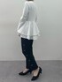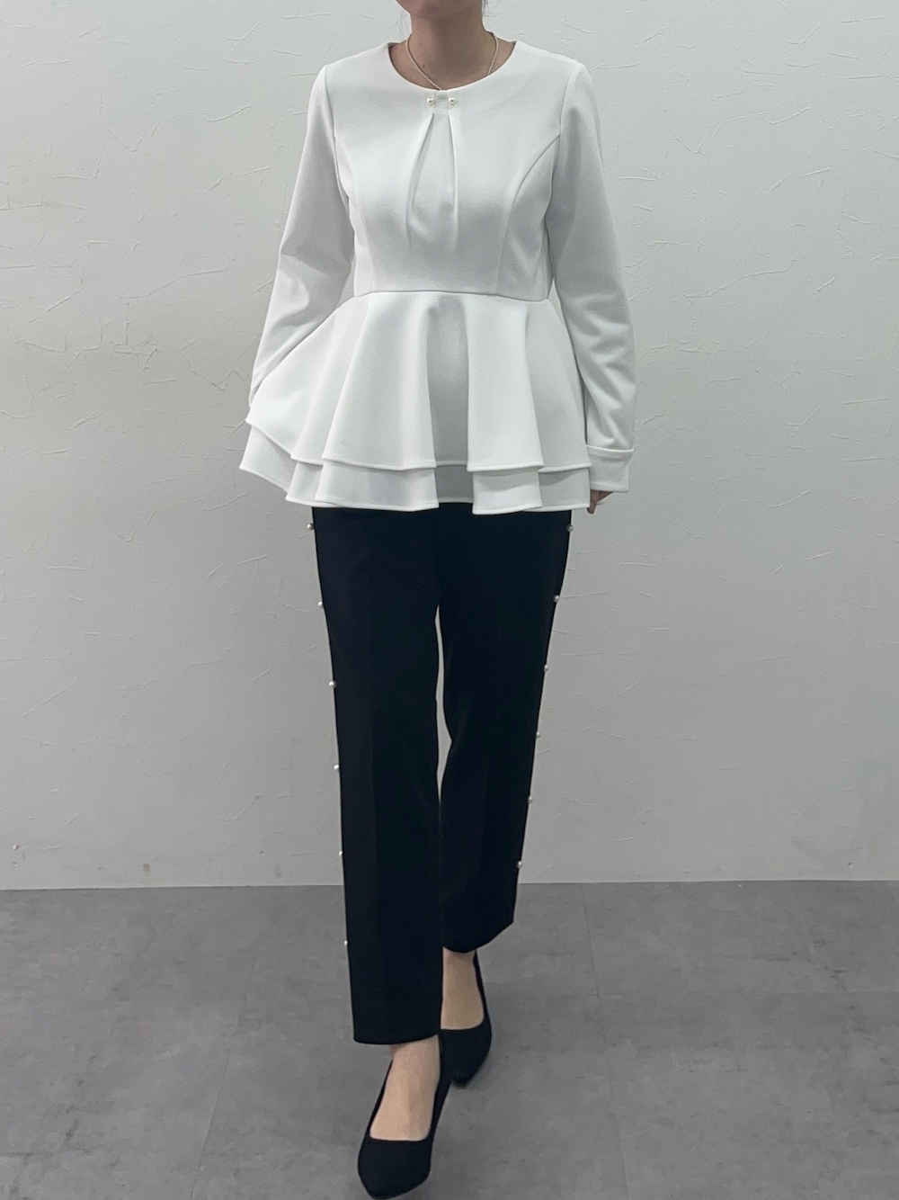 2段のフレアが腰回りをカバーしつつ、パンツのサイドにあしらわれたパールが👍🏻 モノトーンだけど地味にならない、主役級の組み合わせ✨ ーーーーーーーーーーーーーーーーーーーーーーーーーーーー 身長:157cm 骨格:ウェーブ 普段着用サイズ トップス:M ボトムス:XS S パーソナルカラー:ブルベ夏
