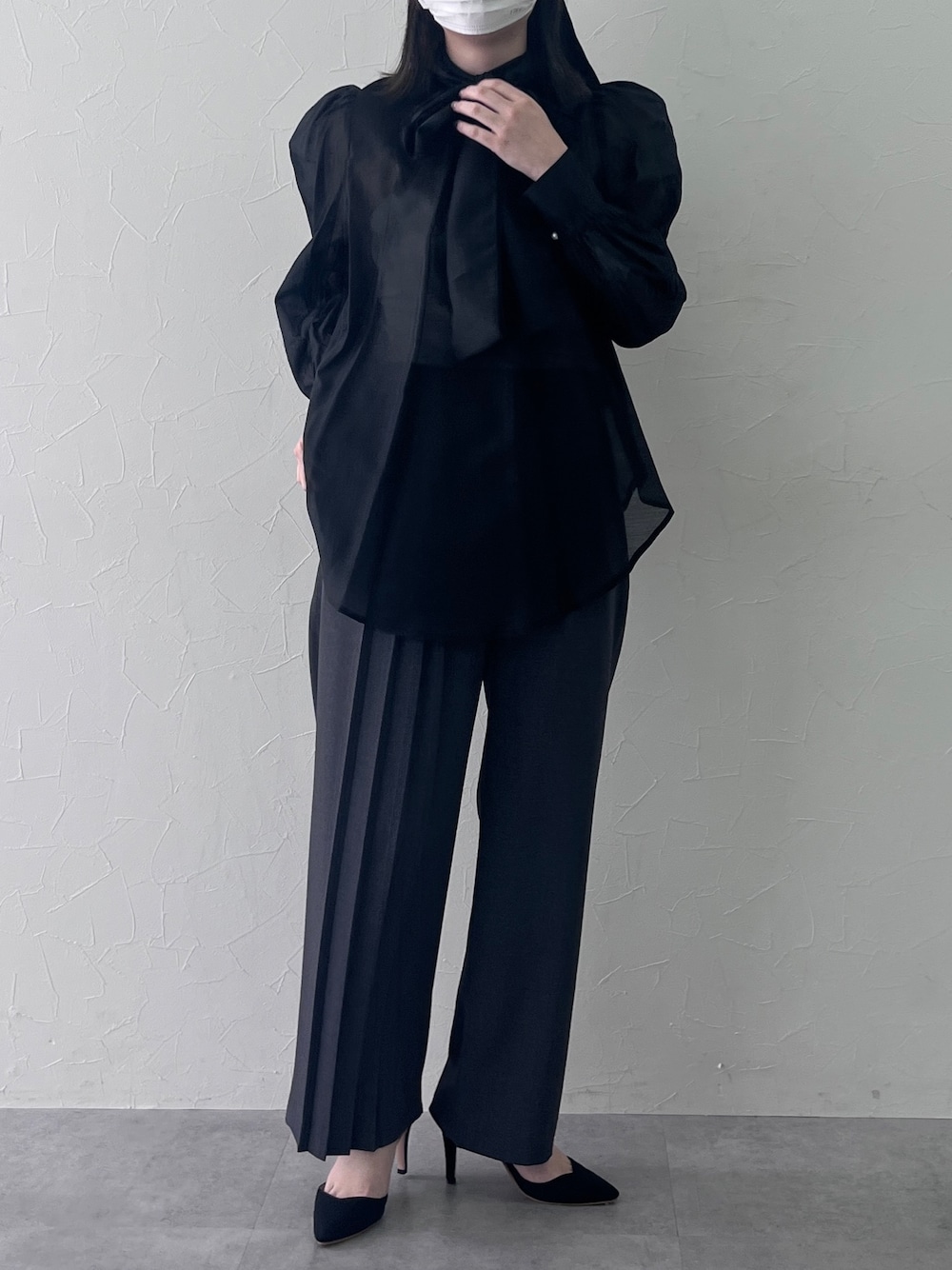 甘めなリボンブラウスを、あえてグレーのプリーツデザインパンツでモードに🖤 重たくなりがちな黒コーデも、シアーな素材感と落ち感のあるパンツで軽やかに見せるのがポイント👍🏻 ウエスト周りをカバーしつつ、脚長効果も狙えるシルエット✨ 卒入園などのオケージョンはもちろん、仕事終わりのディナーにもおすすめの一着🔍 ーーーーーーーーーーーーーーーーーーーーーーーーーーーー 身長:157cm 骨格:ウェーブ 普段着用サイズ トップス:M ボトムス:XS S パーソナルカラー:ブルベ夏