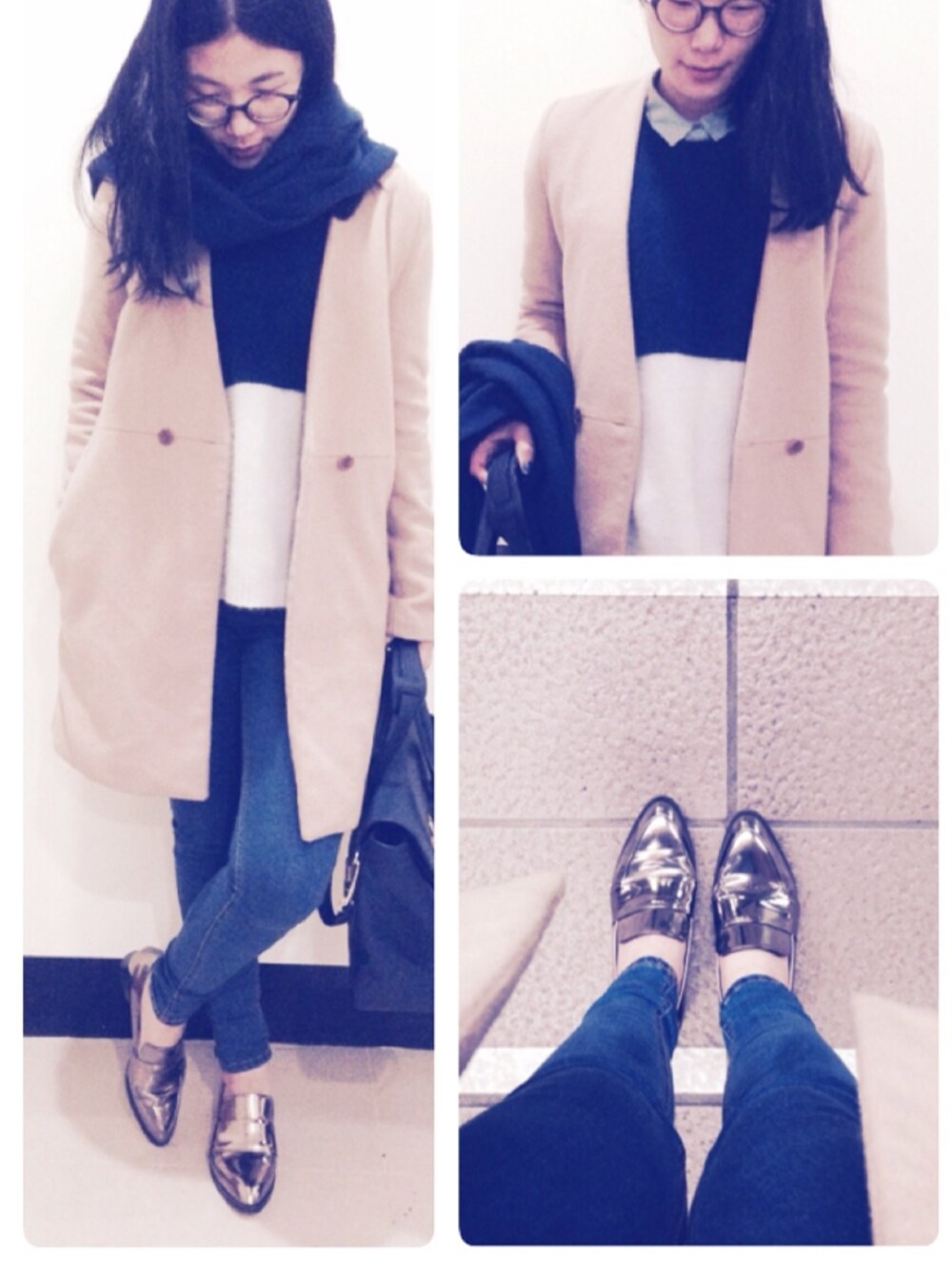 藍色與裸色的穿搭;在冬天的雨裏。 藍白色的毛衣+貼身的牛仔褲+裸色長大衣+深藍圍巾+金色皮鞋|少女