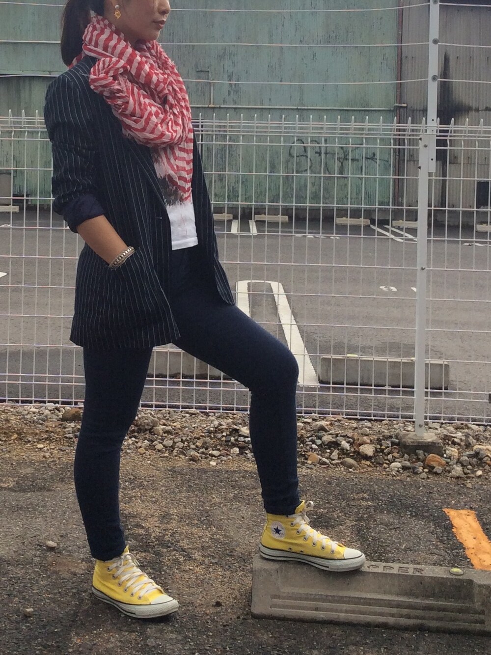ジャケット:THOMSEN ストール:ZARA パンツ:SISLEY シューズ:CONVERSE
