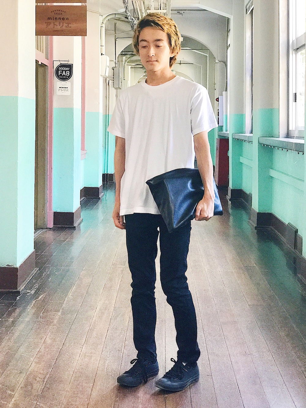レザーのクラッチバッグを使った、シンプルなTシャツコーデです。ミニマリストらしく白と黒のモノトーン配色。