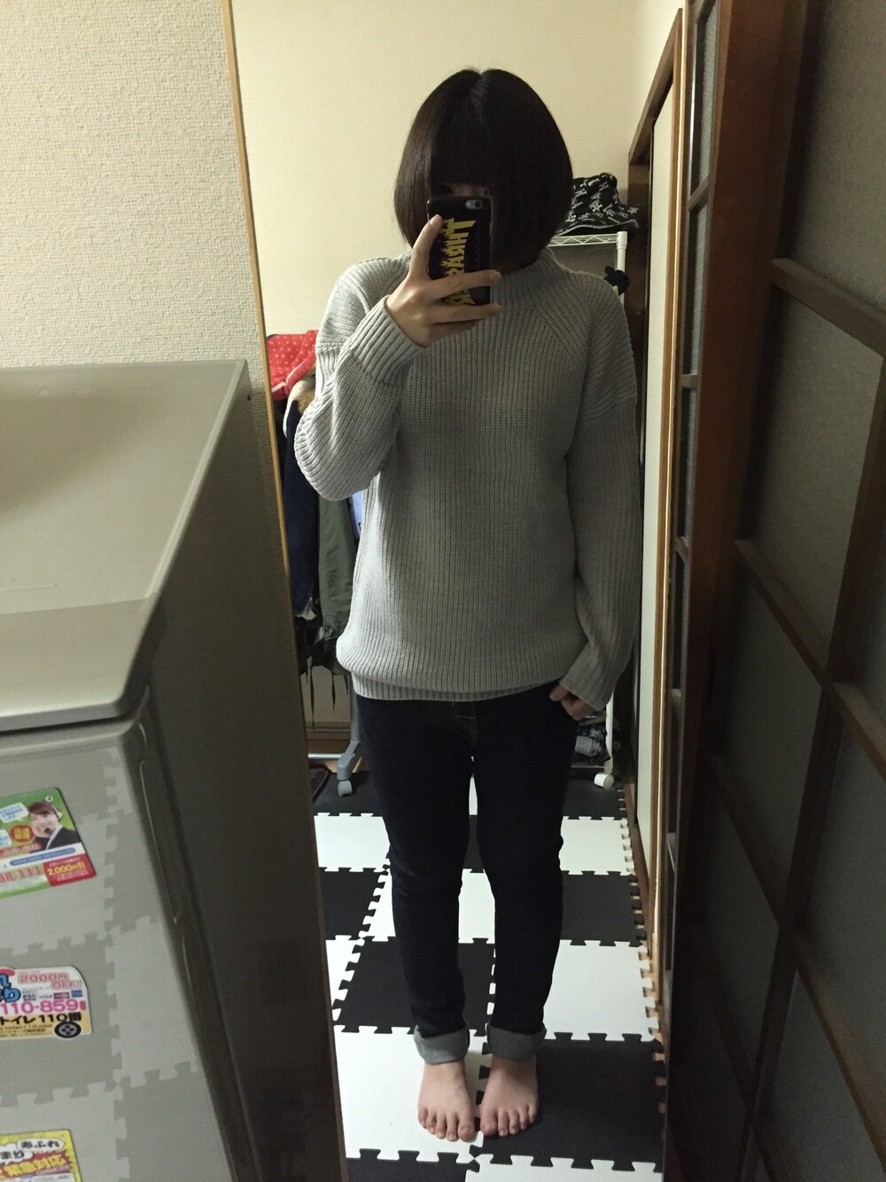 グレー系のニット/セーター、ブルー系のデニムパンツを着用したレディースの冬コーディネートの1枚目の写真