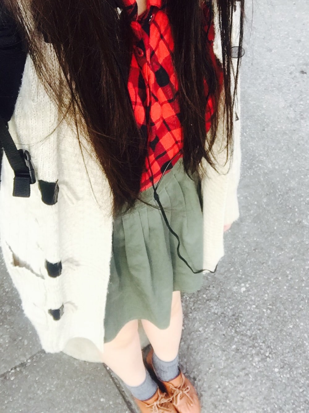リュック系ヘッドホン女子。 包み込みたくなるはずのニットアウター萌え袖。ガタイのいい女の子でもきっと効果あるはず。 洋ナシ型体型には、腰で絞ってくれるすそ広がりスカート万能説。 靴下で足太く見えそうだけど、バランス問題。 絶妙な長さコントロールで頑張る細見せ。