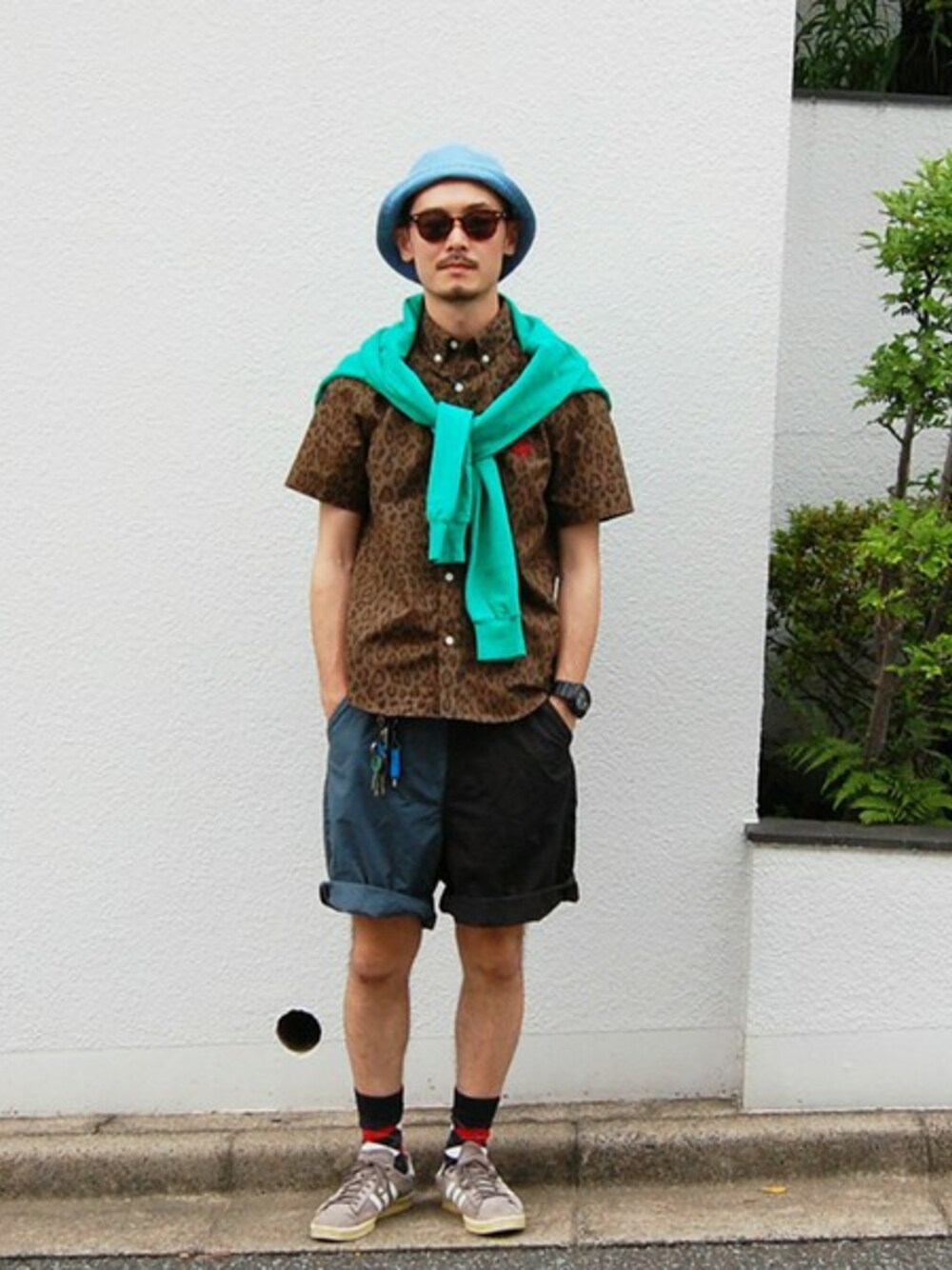 レオパード柄ボタンダウンシャツに 配色切り替えしデザインと股上が深めな サルエルタイプシルエットが特徴的な ショーツを合わせたスタイリングです。
