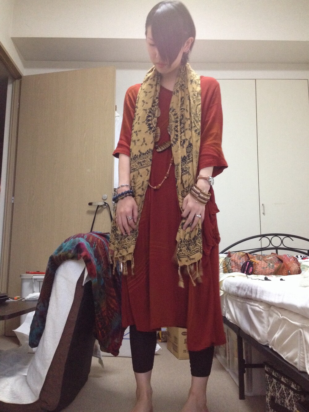 雨で若干寒かったので袖丈長めのワンピースに、レギンス、ストールで保温!