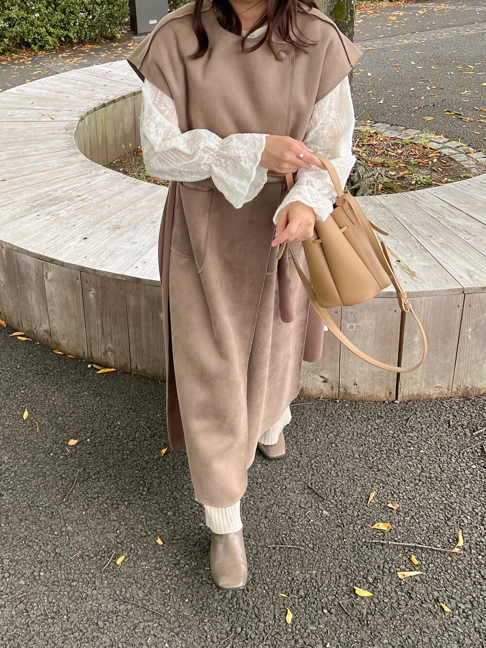 Instagramでたくさんいいねをいただいて嬉しかった秋コーデ🍂 フェイクムートンロングベストが主役のコーデです🤎