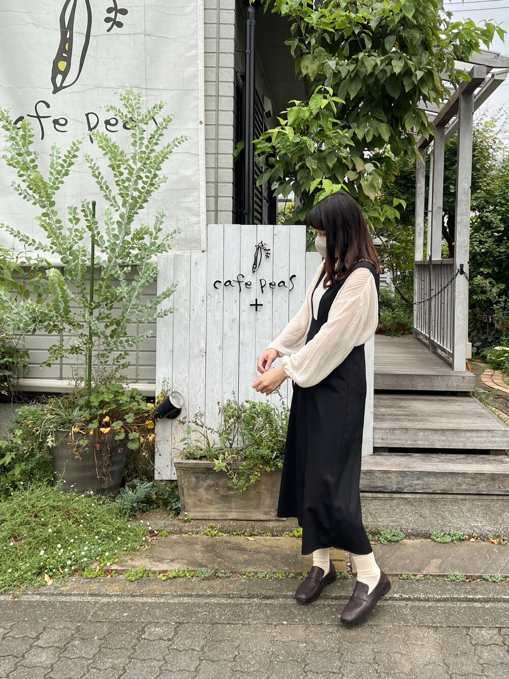 秋のカフェコーデ☕️🍂 このサロペットスカートスタイルよく見える🐈⬛🤍 ローファーに合わせたつぶつぶソックスはインスタに載せてます🧦