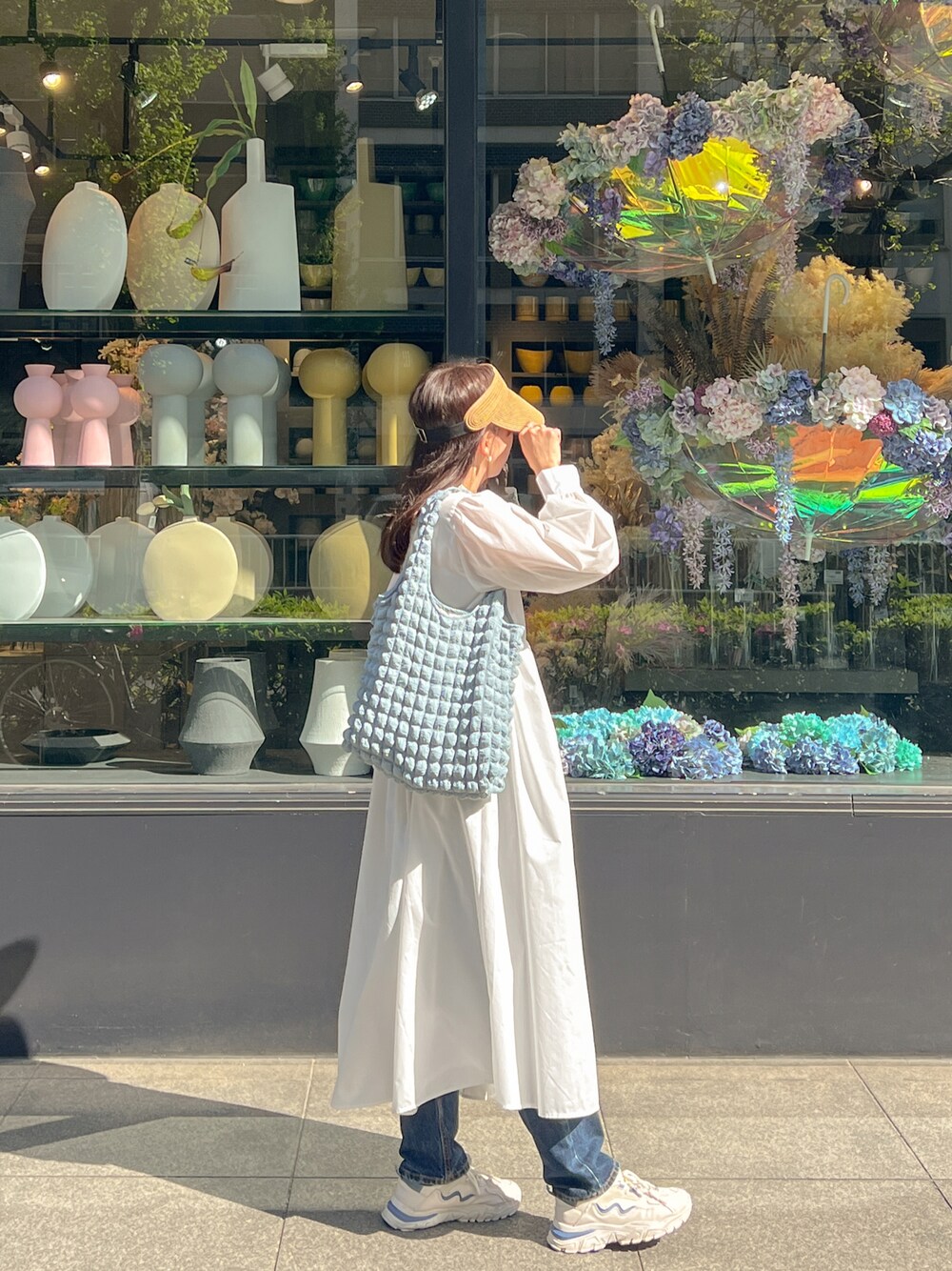 ぽこぽこがかわいいポップコーントートバッグ🍿💙 ライトブルーにしたよ🐋🫧 白ワンピと相性◎でした🤍