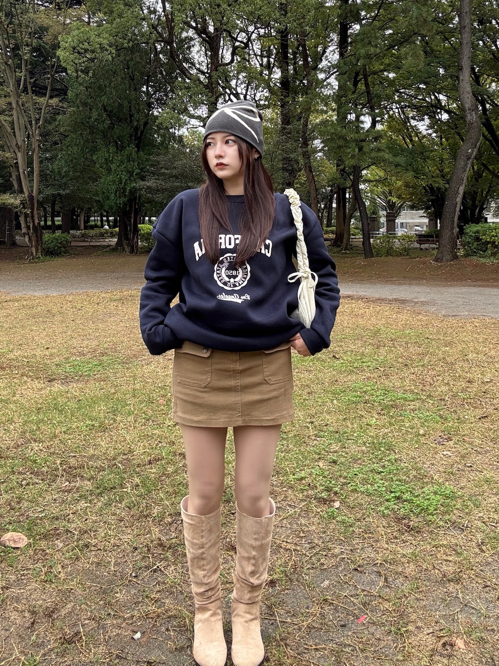 ボーイズライクな秋コーデ ラフなコーデには、ドロストバッグとビーニーのリボンでガーリーさをプラス! 動きやすくリラクシーなコーデです! アクティブシーンにおすすめです✨