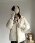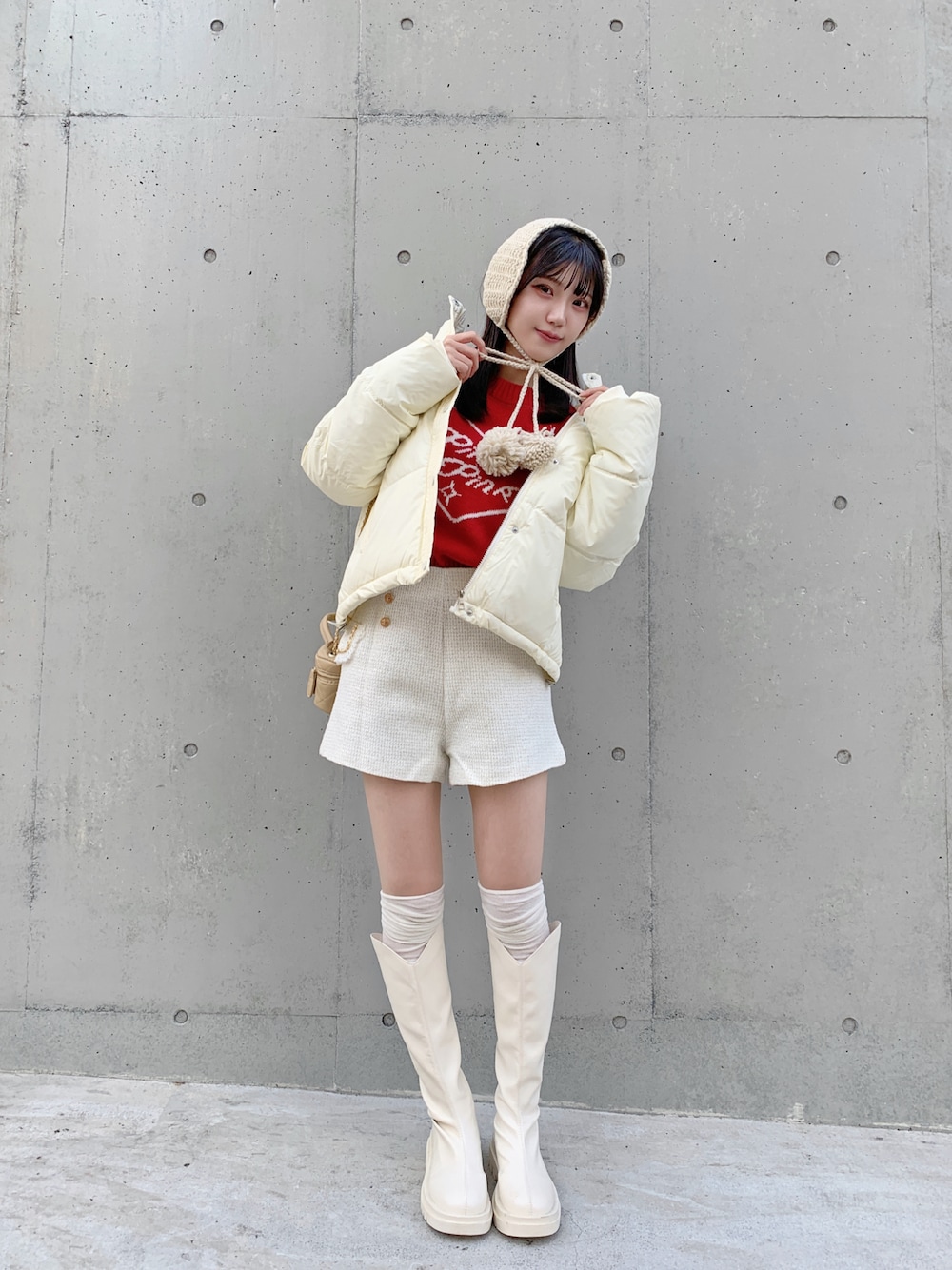 ホワイト×レッドがかわいいクリスマスコーデです♡ クリスマスマーケットなどのイベントを盛り上げるコーデにいかがでしょうか?🎄 新作のダウンジャケットは軽く、スリムなシルエットとショート丈がポイント◎ 大人気のポンポンイヤマフと合わせてガーリーなコーデに🤍