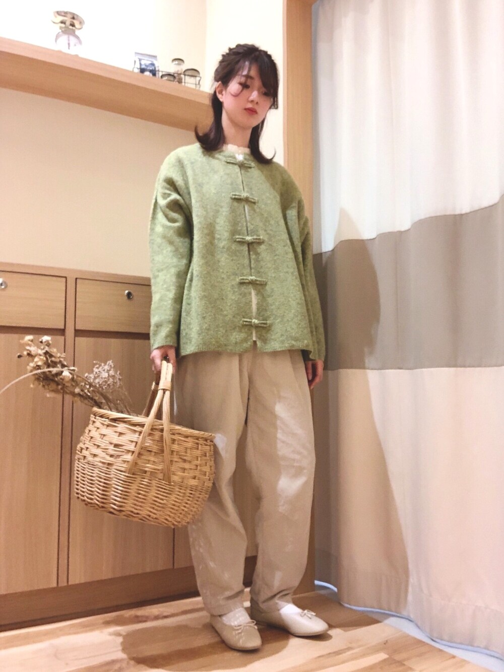 ご覧頂きありがとうございます✨ 久しぶりの投稿です! ~チャイナコーデ Spring🌱~ 今流行りのチャイナ釦のカーディガンは1枚でコーデの主役に! クルーネックなので、スタンド衿のブラウスと合わせると衿元が出てすごく可愛いです!