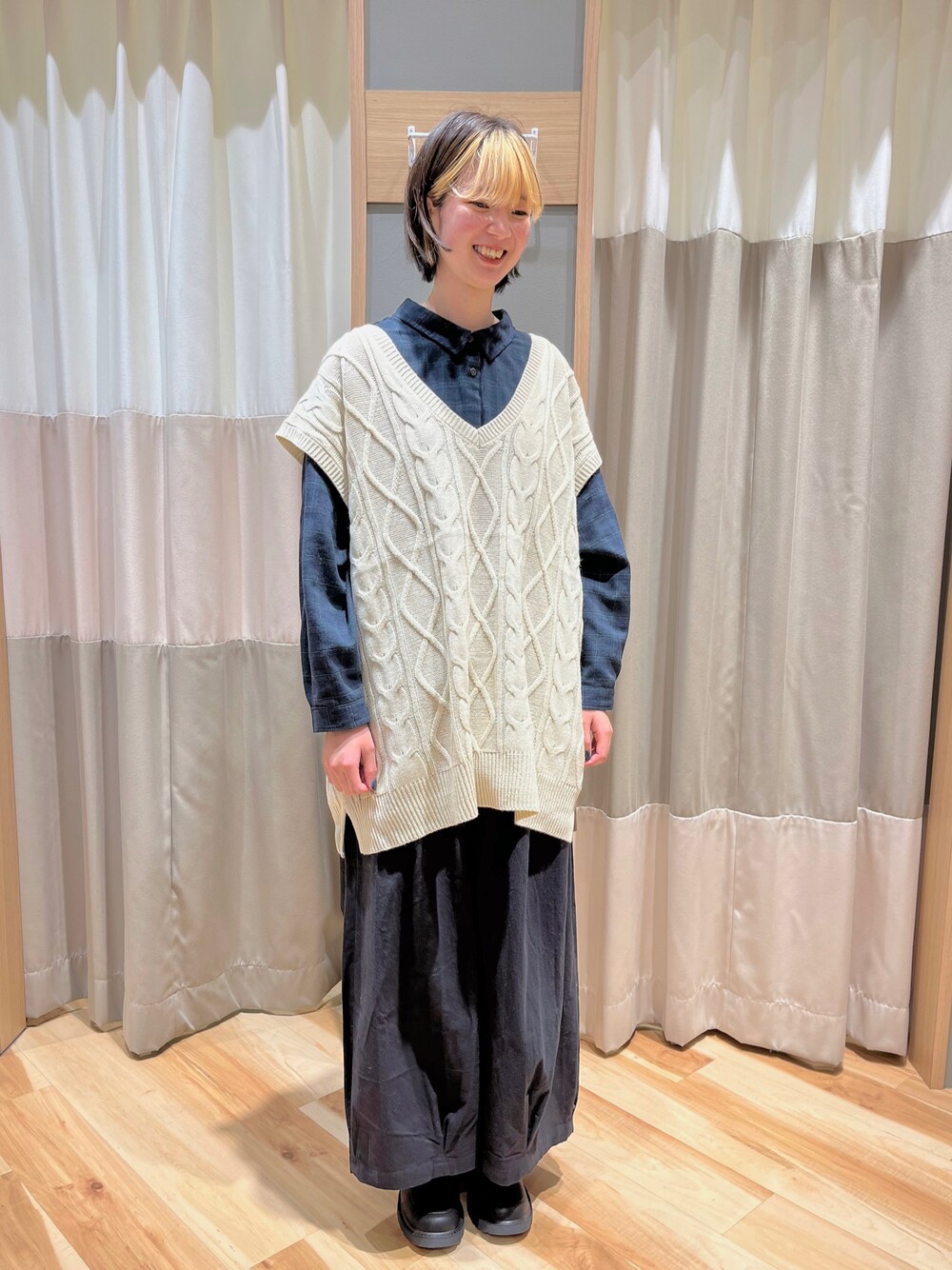 kahoのベスト「ケーブル柄編みニットベスト」を使ったコーディネート