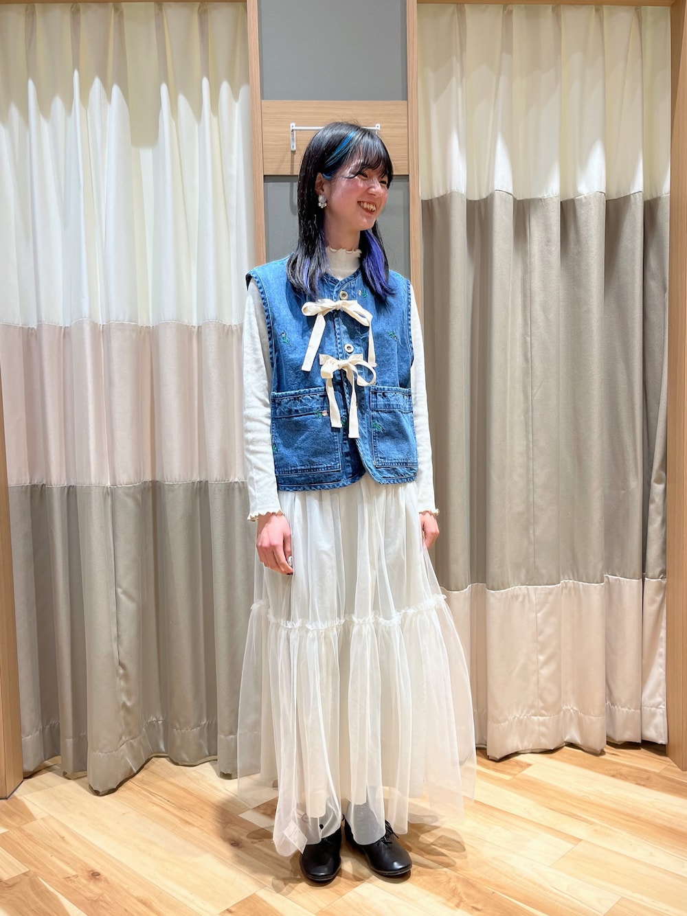 ご覧頂きありがとうございます.*。 ゚ ~春のデニムベストコーデ💙~ デニムベストとチュールスカートの 組み合わせは春らしさ抜群𖤣𖥧𖥣𖡡𖥧𖤣 ベストには花の総刺繍があるのも ワンポイントになって可愛いです!!