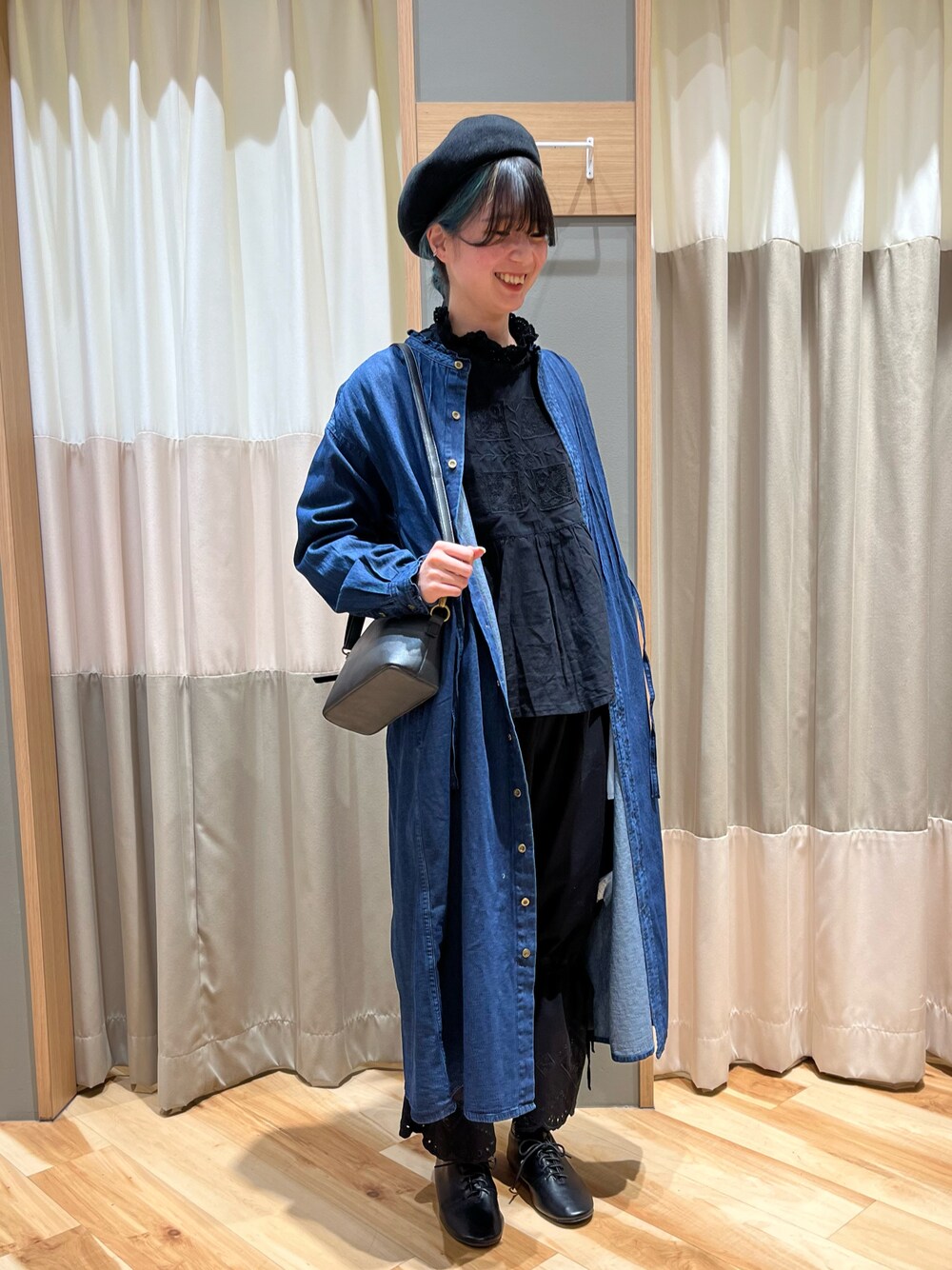 ご覧頂きありがとうございます.*・゚ ~カジュアルガーリーコーデ💙🖤~ ガーリーなセットアップにデニムワンピを 合わせるとガラッと雰囲気が変わってカジュアルガーリーな印象に大変身 ·͜· ワンピースのボタンを全て閉めるのも おすすめです!!