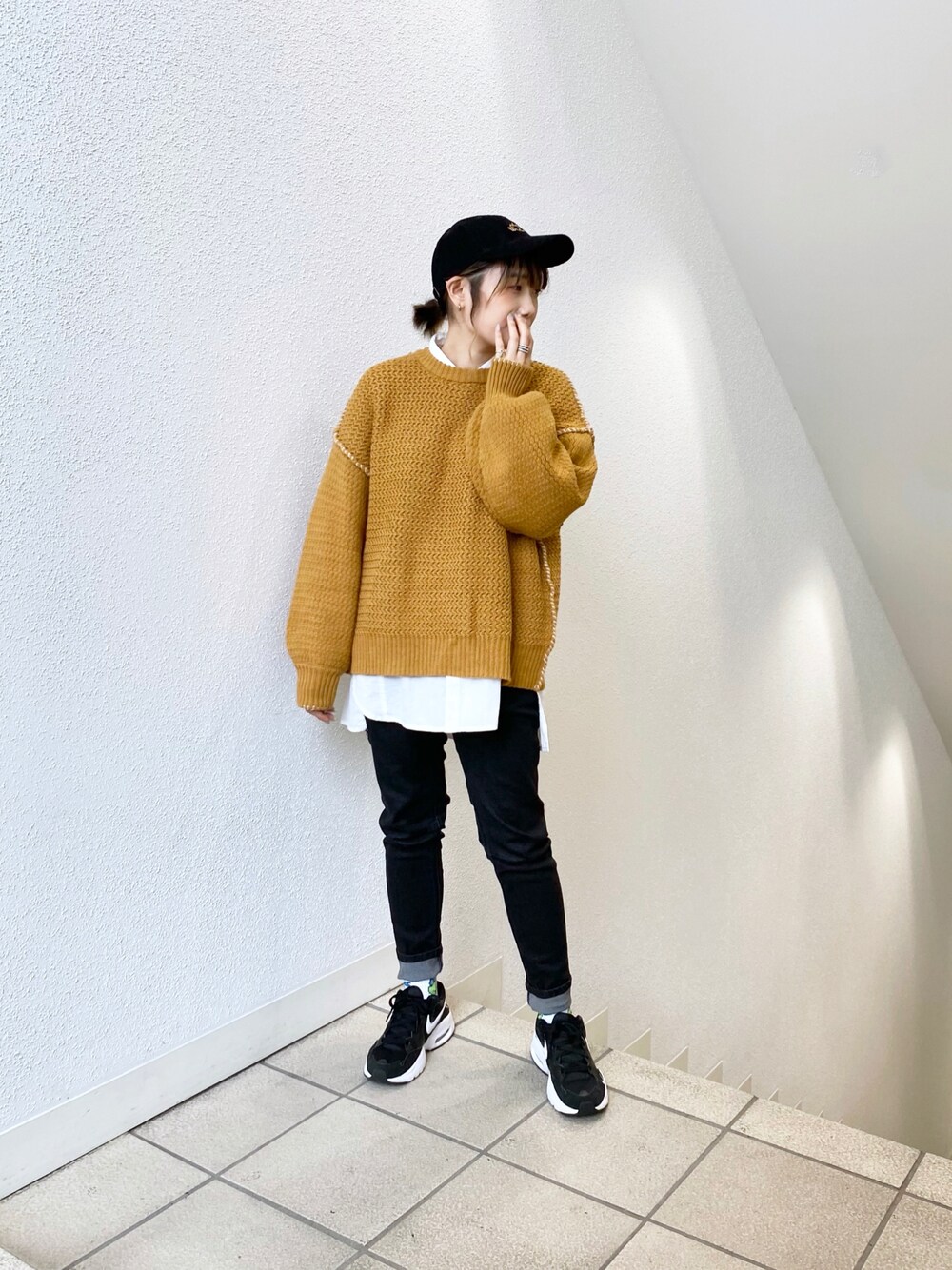 袖にボリュームのあるニットとシャツをレイヤードして、スリムサルエルパンツを合わせることでカジュアルなコーデにしました🐣