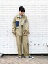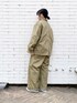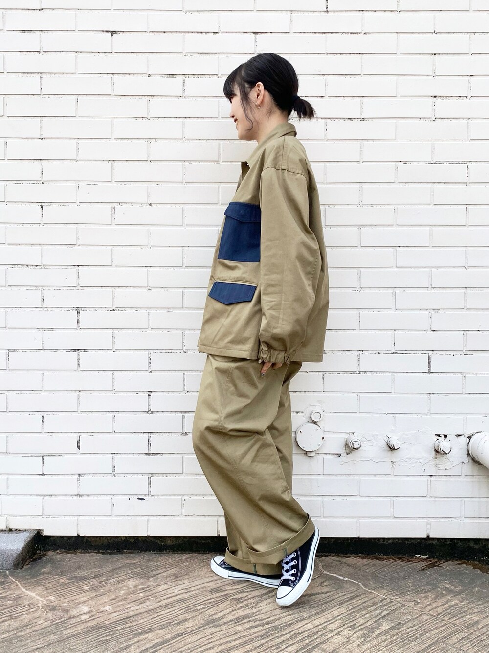 ワークテイストのシンプルなカバーオールは、ポケットが異素材になっていてワンポイントアクセントになっています! フシミンのようにフラップポケットの見せ方を変えるだけで雰囲気がガラッと変わりますよ〜♬ セットアップなので、もちろんパンツも同じ異素材仕様になっています◎ ストレートなシルエットのワイドパンツになっていて、ゆるくて履き心地の良さに加え、さらにパンツのシルエットがキレイに出せてオススメです! メンズライクや古着コーデが好きな方は必見のアイテムです\( ˆoˆ )/!!